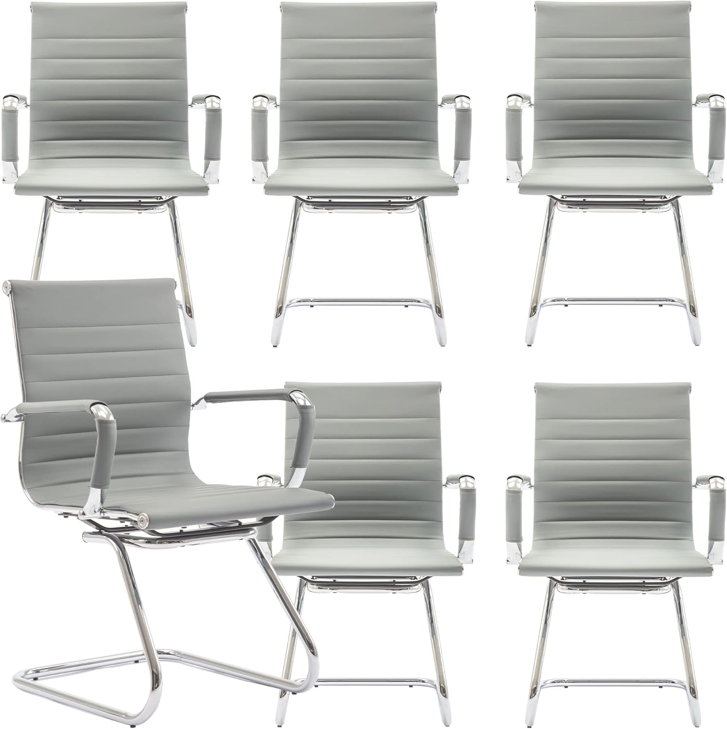 Office Desk Chair Set of 6,No Wheels PU Leather Computer Chairs Mid Back Guest Chairs with Seld Base for School/Reception/Conference/Waiting Room,Grey