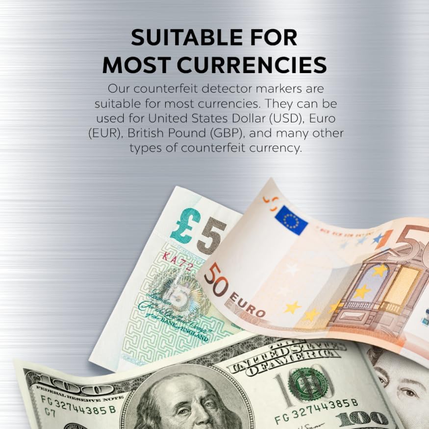 - SUITABLE FOR MOST CURRENCIES: Our counterfeit detector markers are suitable for most currencies. They can be used for United States Dollar (USD), Euro (EUR), and other paper banknotes.