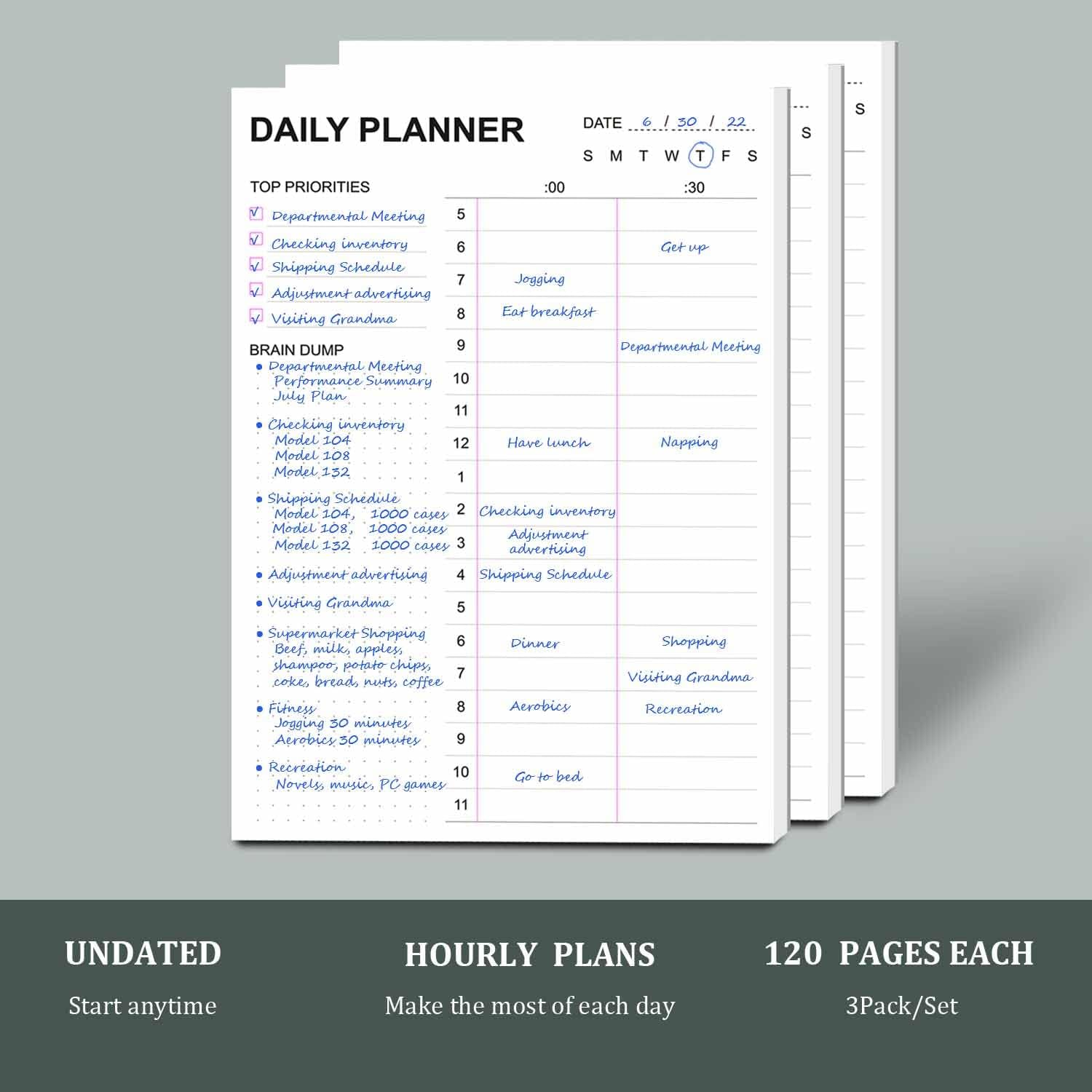 - 7"x10" SIZE & UNDATED - This undated daily to do list notepad measures 7"x10", with 60 tear-off sheets, which contains hourly schedules, top priorities, brain dump, to do list for note-taking, lists, goals etc, which help you manage your time efficiently and achieve your goals perfectly. Undated daily planner notepad makes it easy for you to start at any time