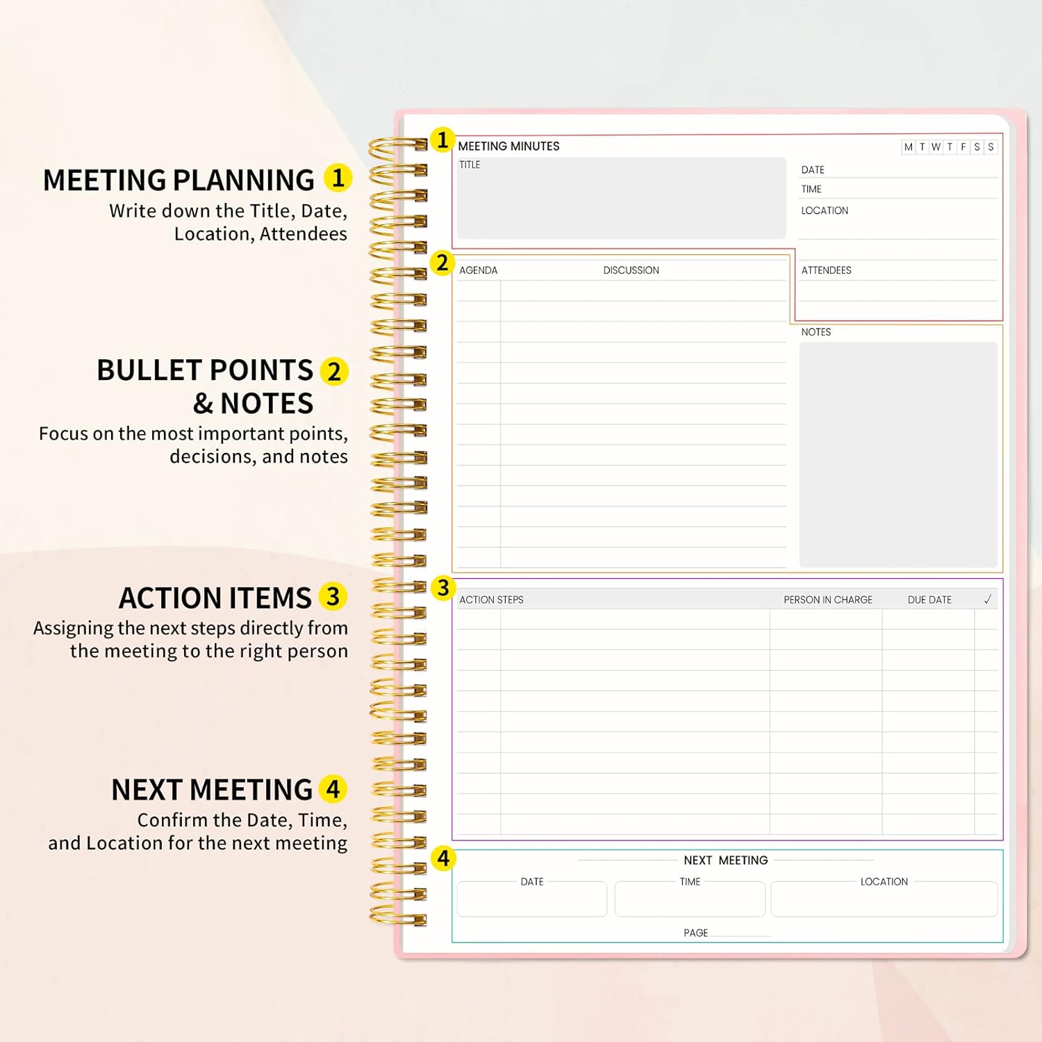 - Better Tool Drives Better Meetings: The hassle of organizing the chaotic meeting notes VS this professional meeting notebook. Definitely a step up! Everything is neatly zoned on each page makes it a breeze to fill them out and ensure all you need are accounted for. Each meeting journal comes in exclusive protective packaging and accompanying by our client service commitment to your utmost satisfaction.