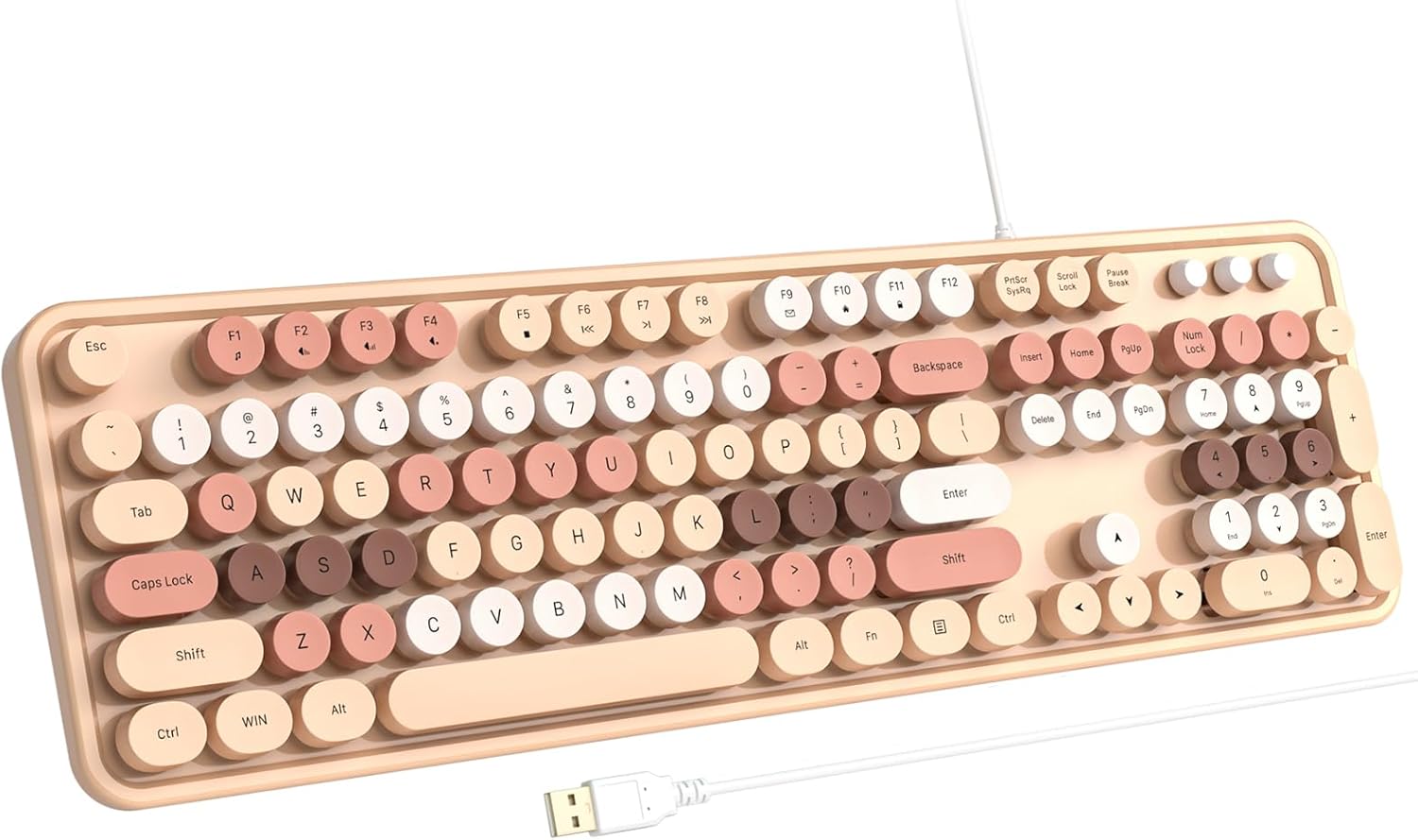 - 【Retro Typewriter Keyboard】Cute round keycaps, crisp and sweet sound, perfect knocking feel, let you find the feeling of a retro typewriter. And it’s detachable, making the keyboard easy to clean.