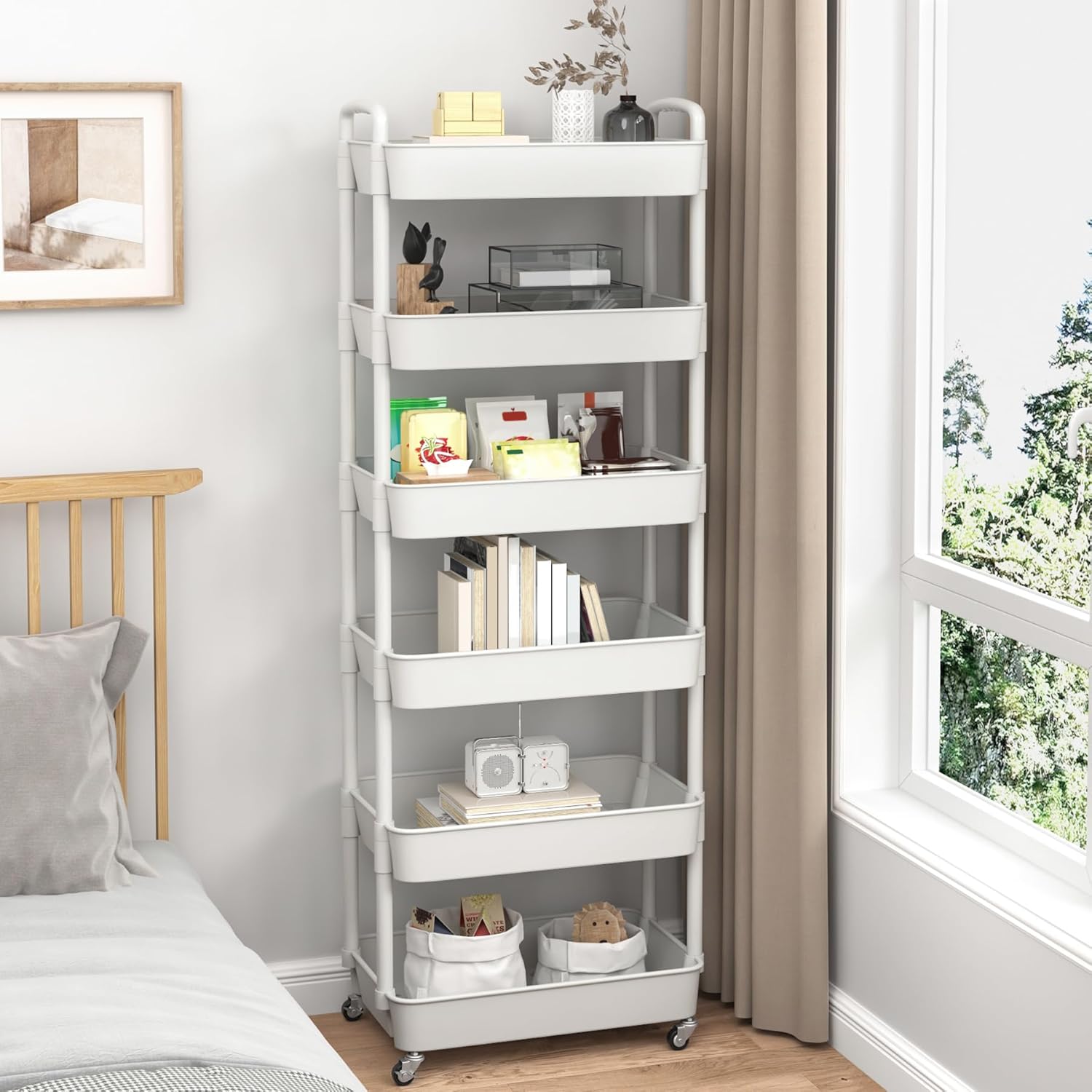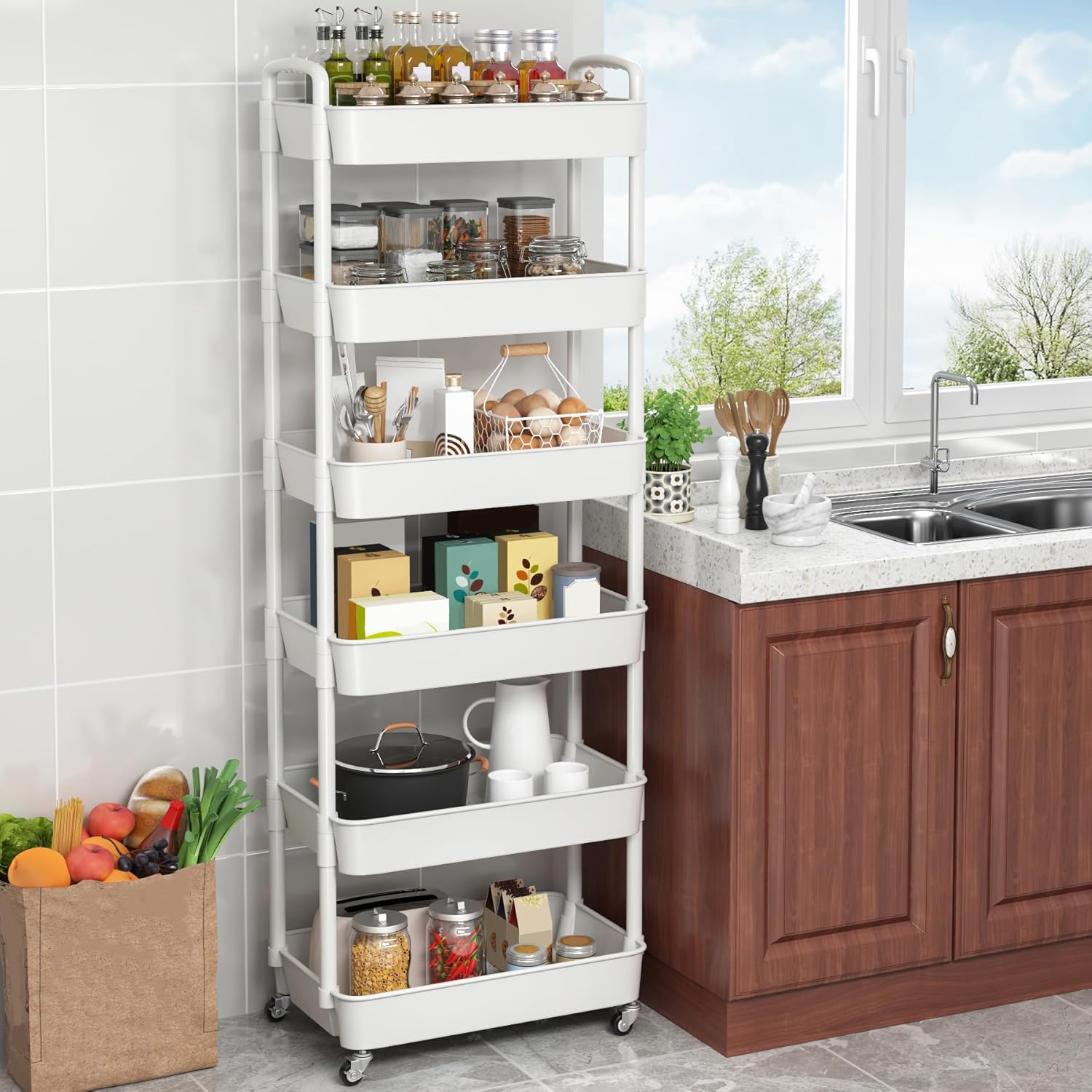 Sywhitta 6-Tier Plastic Rolling Utility Cart with Handle, Multi-Functional Storage Trolley for Office, Living Room, Kitchen, Movable Storage Organizer with Wheels, White