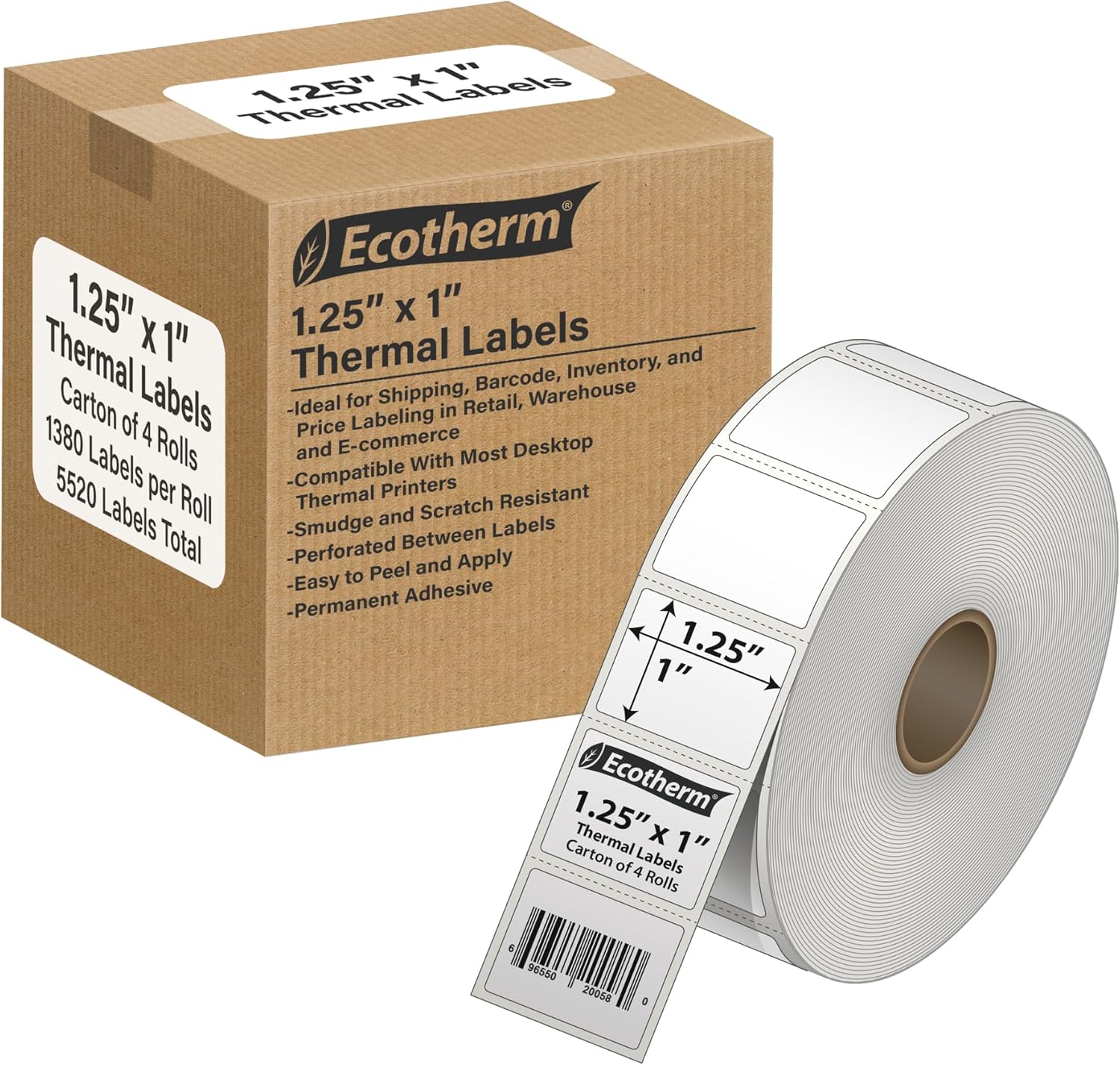 1.25" x 1" Thermal Labels | 4 Rolls | 5520 Labels | fits Zebra, Godex, Arkscan, iDPRT, Offnova Thermal Label Printers and More | Blank White Adhesive Stickers by Ecotherm