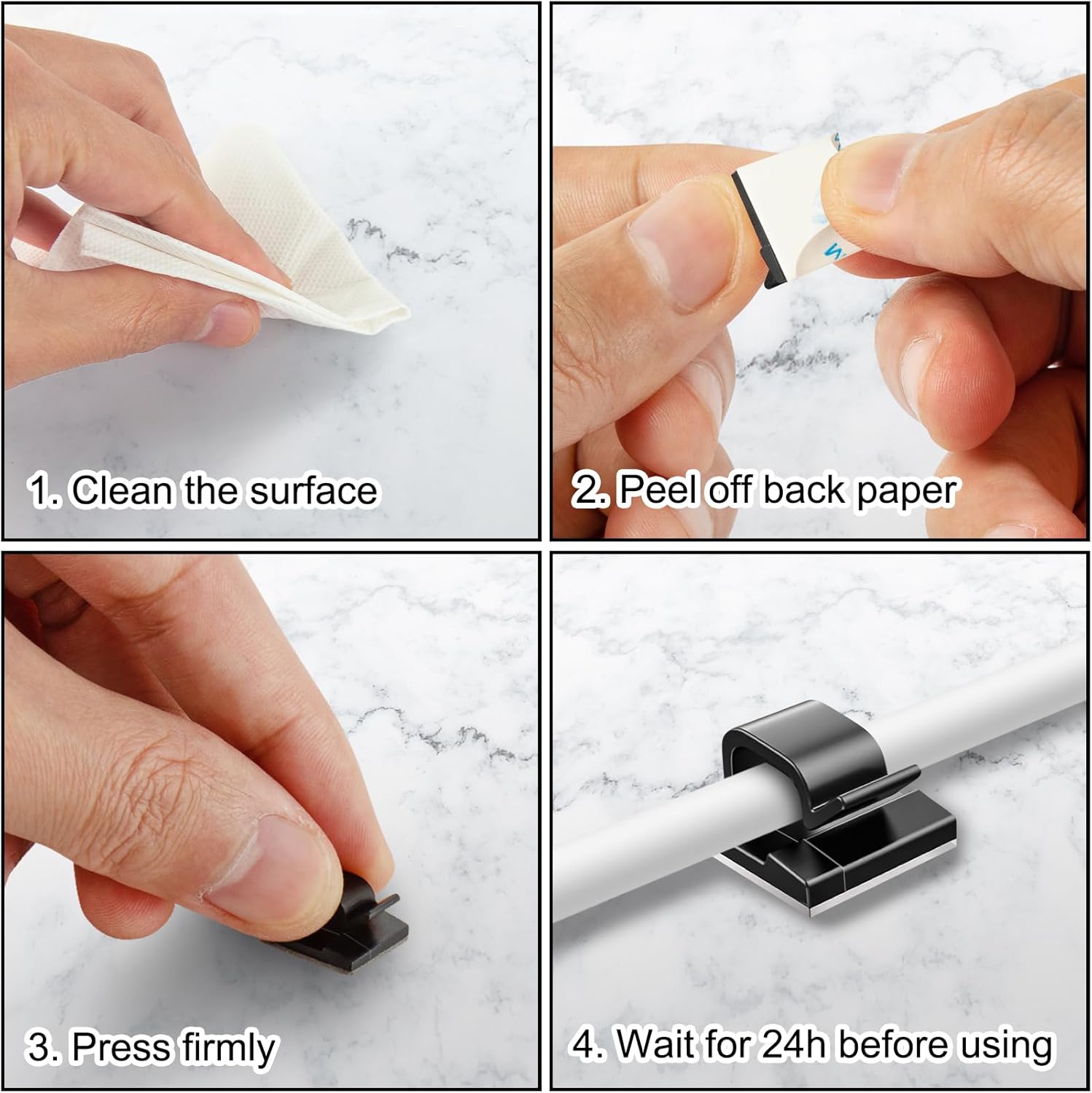 - Self-Adhesive Clips: Sticky cable holder clip with self adhesive pad can grip the surfaces stably which can be removed easily without damage to the desktop and with no residue leaving on the surfaces.