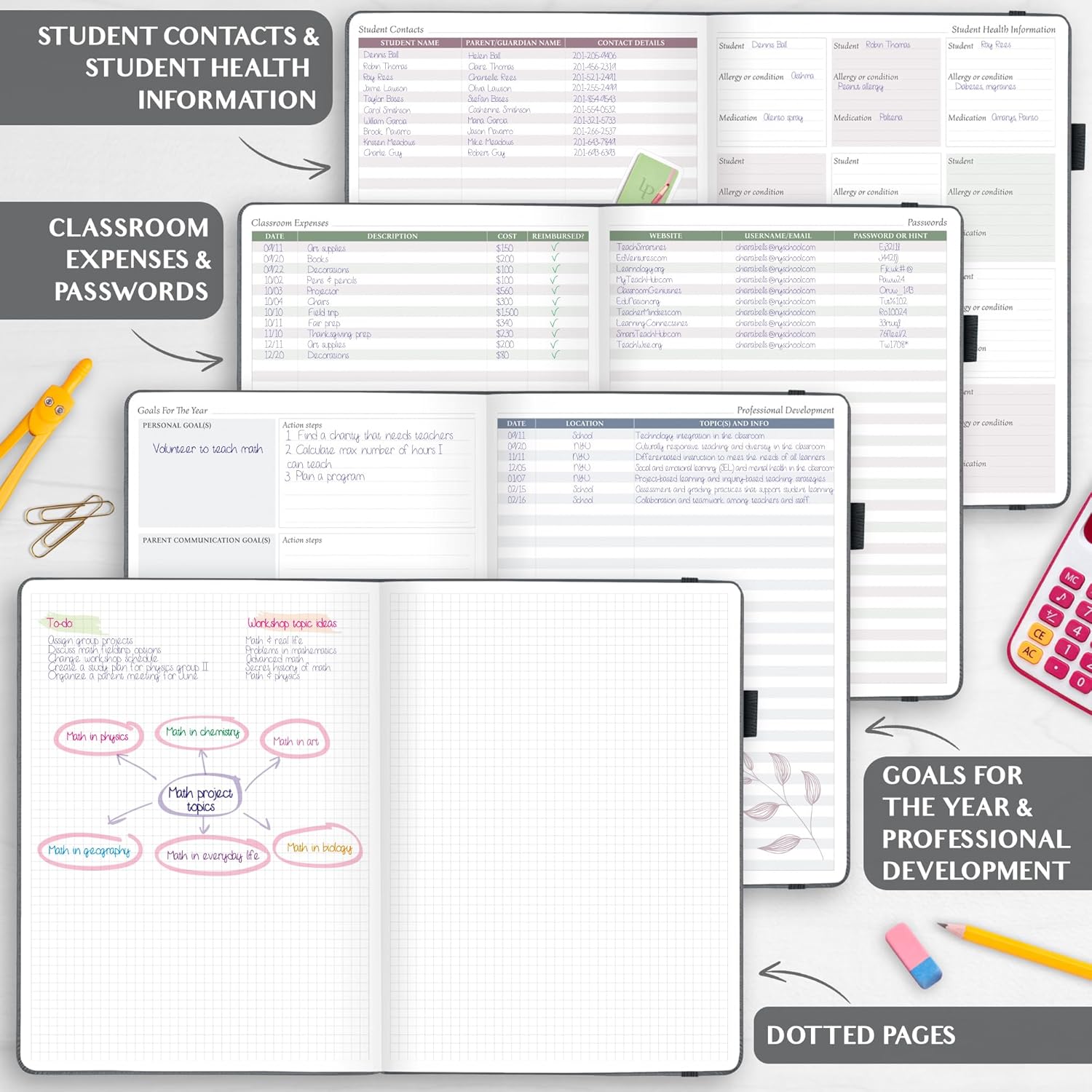 - STORE ALL HELPFUL INFORMATION IN ONE PLACE – At the front of the school year planner, you will find sections for important dates, birthdays, field trips, teaching goals, professional development events, passwords, student contacts and health information.