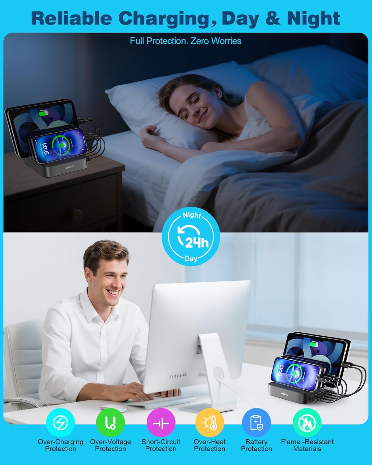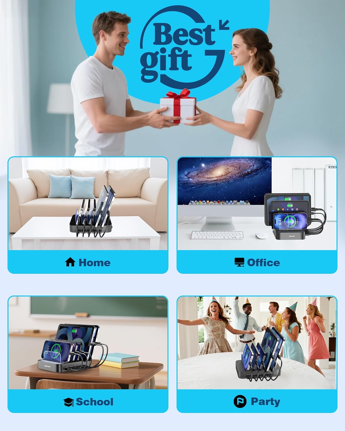 - 【Fast and Smart】This charging station for multiple devices will charge your smartphones, tablets up to 80% than other USB-A charger station with 2.0A or less. Our multiple charging station will automatically detect your devices and adjusts voltage for minimal charging time.