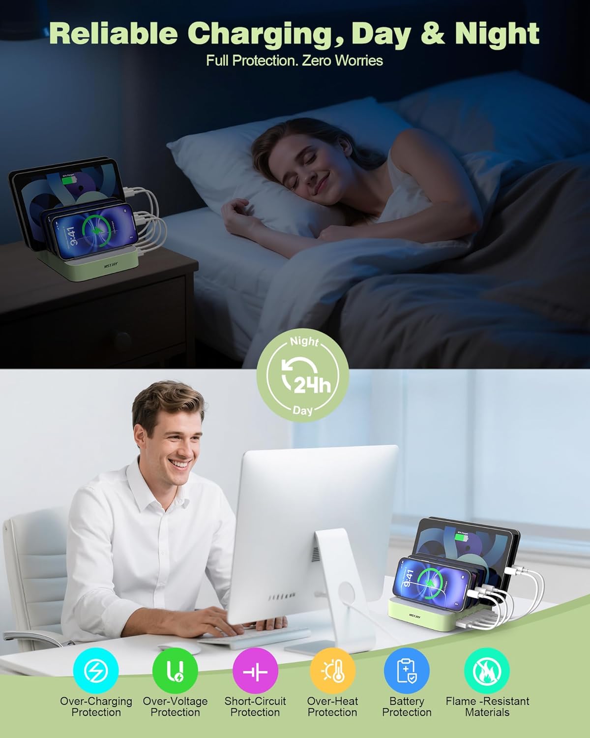 - 【Multi Protection】Every port of the multi charger station will offer exactly the charging current required to match your devices needs, keeping your phones safe. The phone charging station features a safety switch giving you a quick visual indication that it is powered on. Removable dividers can hold your large tablets even with thick case.