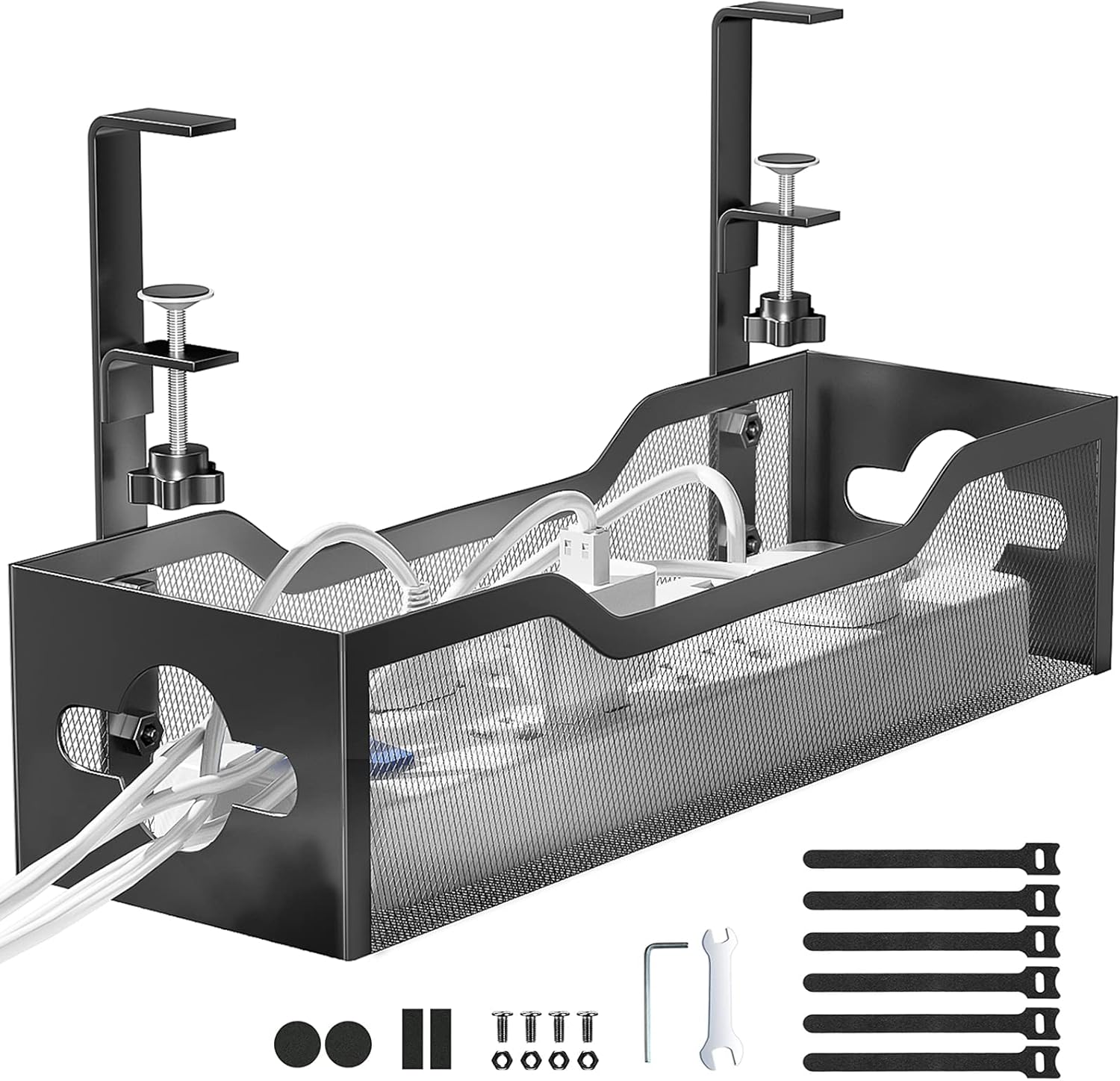 - 【Sturdy and Beautiful】Cord management under desk is made of high-quality carbon steel and holds about 15 lbs. The wire basket has 2 holes on each side of the tray to enable your cables to pass freely. Cable baskets are suitable for desk thickness use from 0.4" to 2".