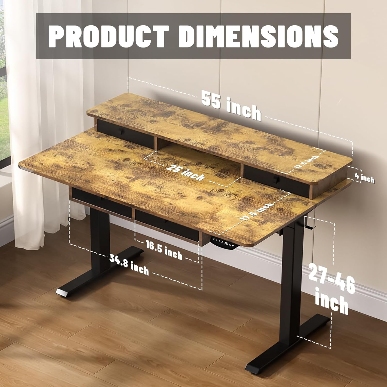 55 * 30 Inches Electric Standing Widened Desk Adjustable Height with 4 Drawers, Double Storage Shelves Stand Up Desk, Home Office Workstation Sit Stand up Desk (Rustic Brown)