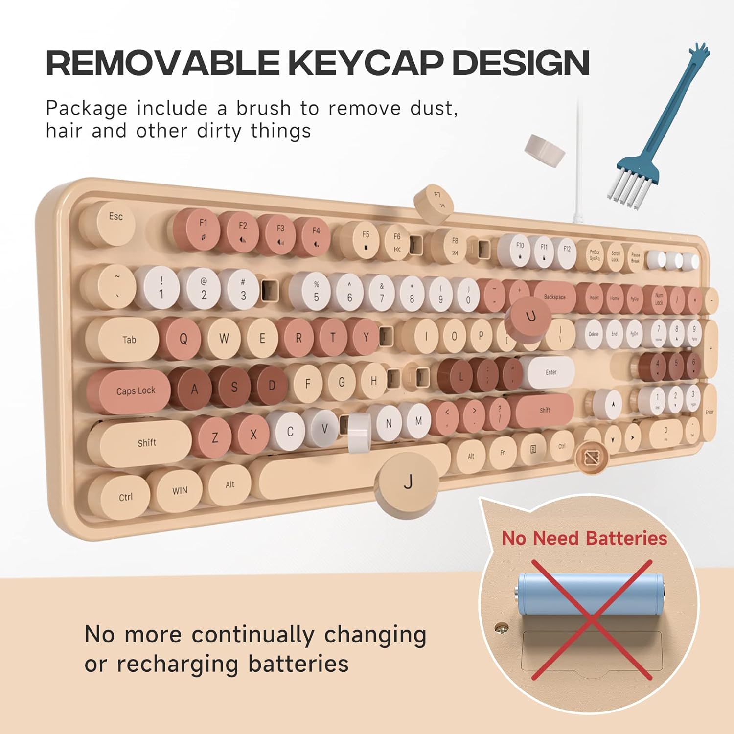 - 【Retro Typewriter Keyboard】Cute round keycaps, crisp and sweet sound, perfect knocking feel, let you find the feeling of a retro typewriter. And it’s detachable, making the keyboard easy to clean.