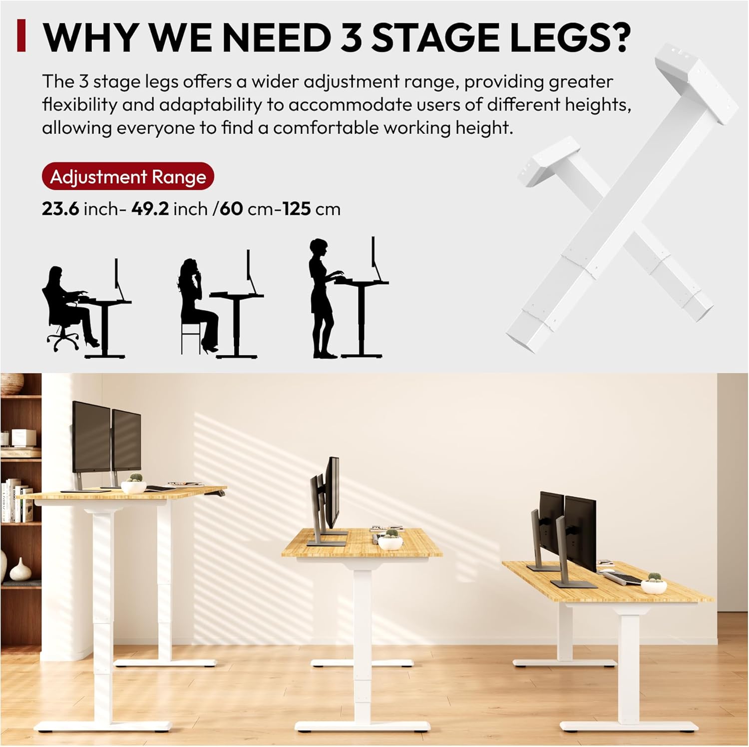 - Adjustable 3-Stage Lifting System for Varied Heights:The 3-stage inverted lifting column provides a discreet and stable lift.Boasts a height range from 23.6” to 49.2”, effortlessly adapting to various height requirements.Enables users to freely switch between standing and sitting positions.