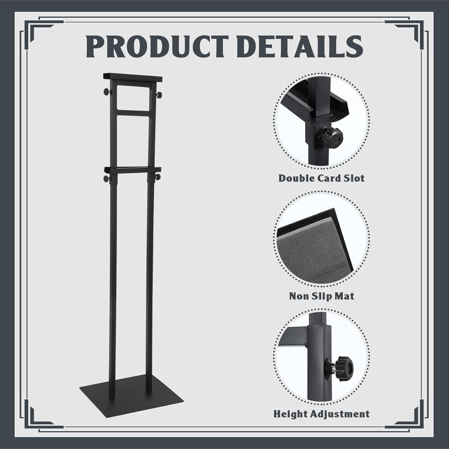 - Solid Base: with 11.8 x 9.5 inches square thick base, the bottom of the poster holder is strong, long lasting, and rust resistant; Coming with a high density foam sheet with non slip pads, the base can enhance stability and protect the floor from wearing and tearing, suitable for indoor and outdoor displays