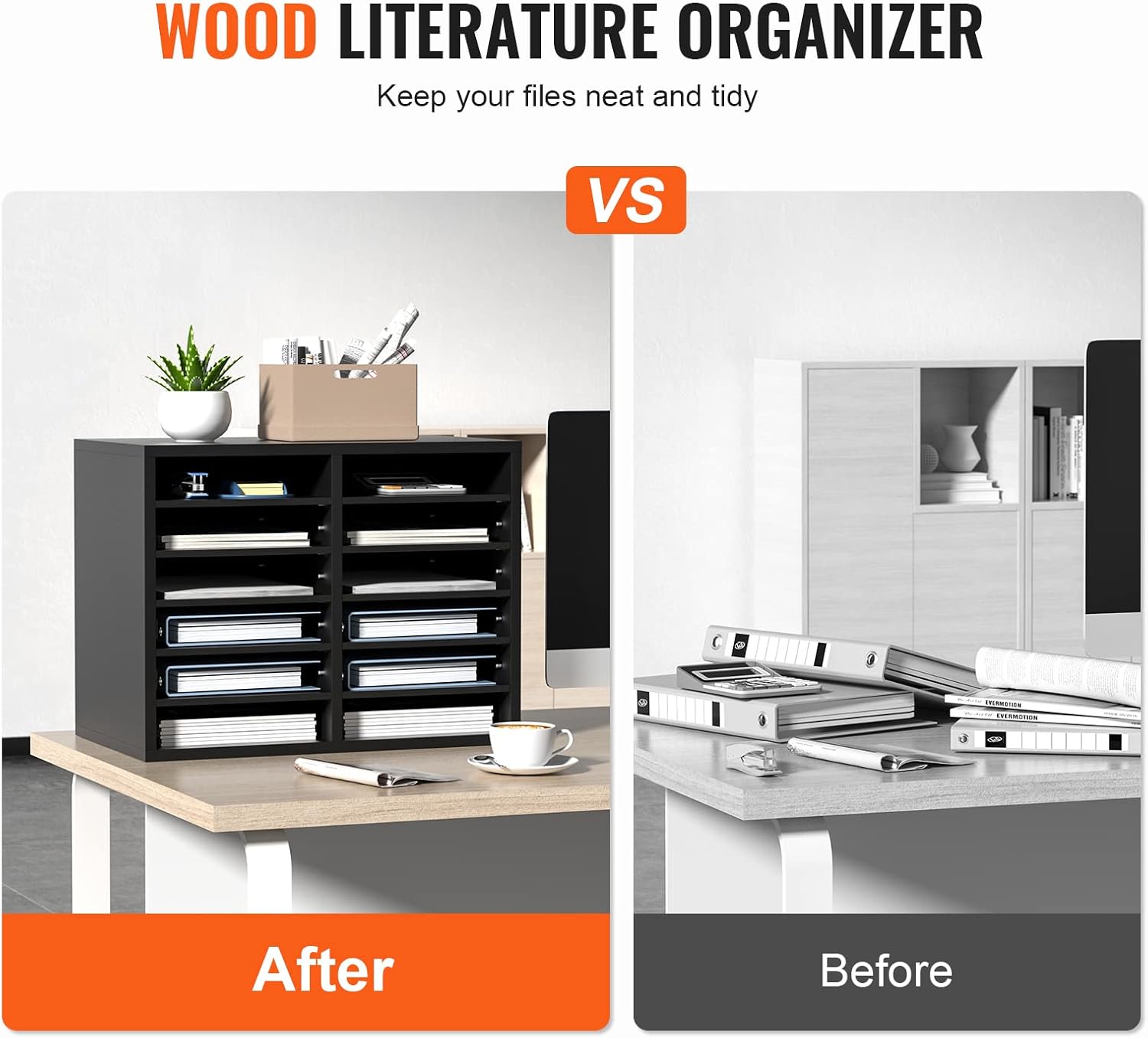 - Maximize Your Space: Say goodbye to cluttered desktops with VEVOR wood literature organizer. It has 12 compartments in total, arranged in 6 rows and 2 columns. You'll have ample space to store and organize books, documents, magazines, papers, and other materials. Keep your workspace neat and tidy with ease.