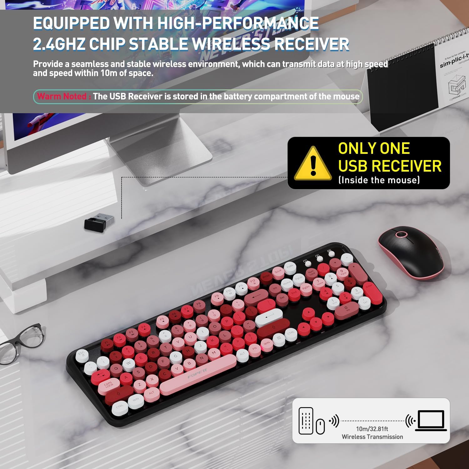 - Colorful Keyboard Shared Receiver : A USB receiver simultaneously drives the keyboard and mouse, enabling wireless transmission with a stable and delay-free signal,2.4G wireless transmission technology, supporting multiple computer types.The design incorporates splash resistance, with a waterproof conductive film that allows liquid to flow out from within the keyboard membrane. The mouse requires one 1.5V AA battery (not included), while the keyboard requires two 1.5V AAA battery (not included).