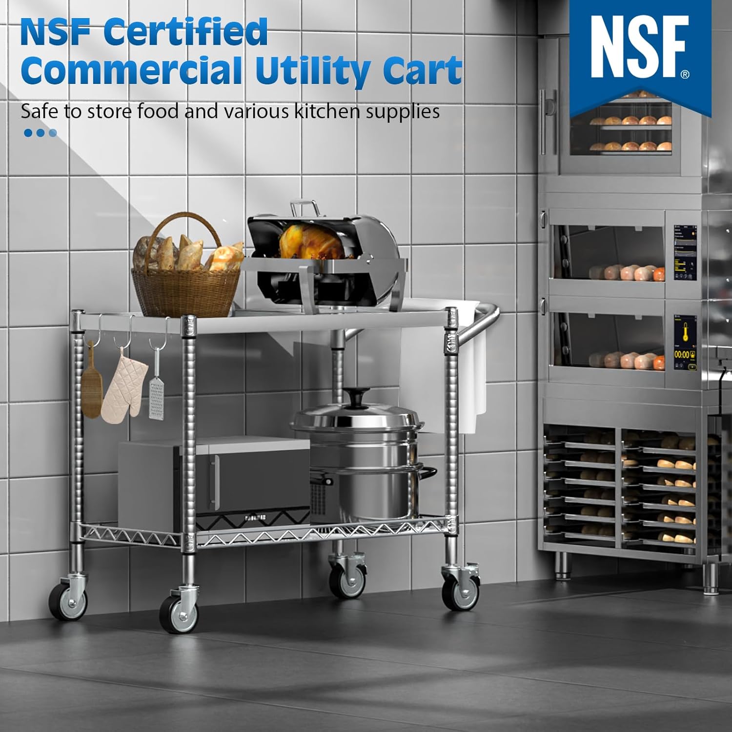 - 【NSF Certified 2-Tier Utility Cart】Certified by NSF/ANSI Standard 2, Leteuke metal cart with wheels is dual-purpose in civil and commercial use, perfect for storing heavy large equipment, large light goods and food, etc. It's enough to transport large household goods and can safely store various kinds of food, kitchen appliances or tools in dry and heated storage environments; dining rooms, kitchens, restaurants, garages and utility rooms, warehouses, offices, supermarkets, studios and so on.