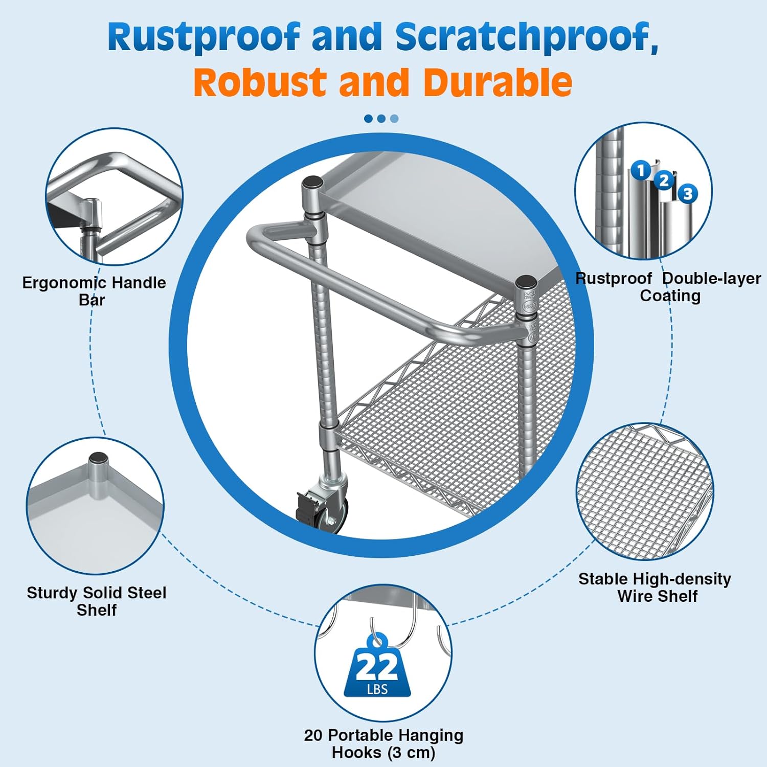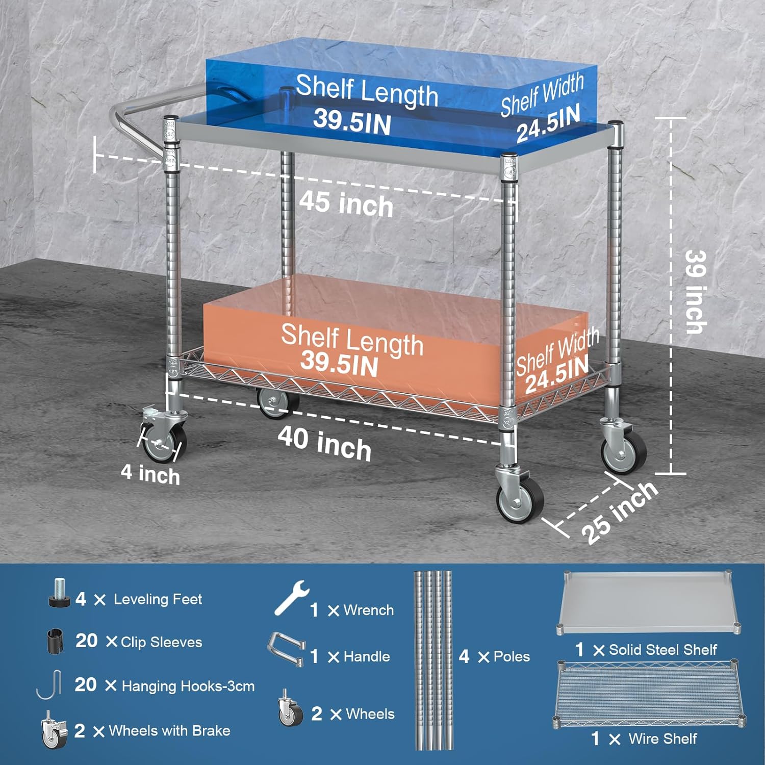 - 【Multifunctional Rolling Carts with Wheels】The 4" wheels of the rolling utility cart are wear-resistant with dual-bearing, including 2 regular casters and 2 locking brake casters. And the ergonomic handle is removable, convenient for converting the cart into a fixed storage shelf when you use the leveling feet. This tool cart also includes 20 pcs metal S-hooks (3 cm), each of which can hold 22 lbs.
