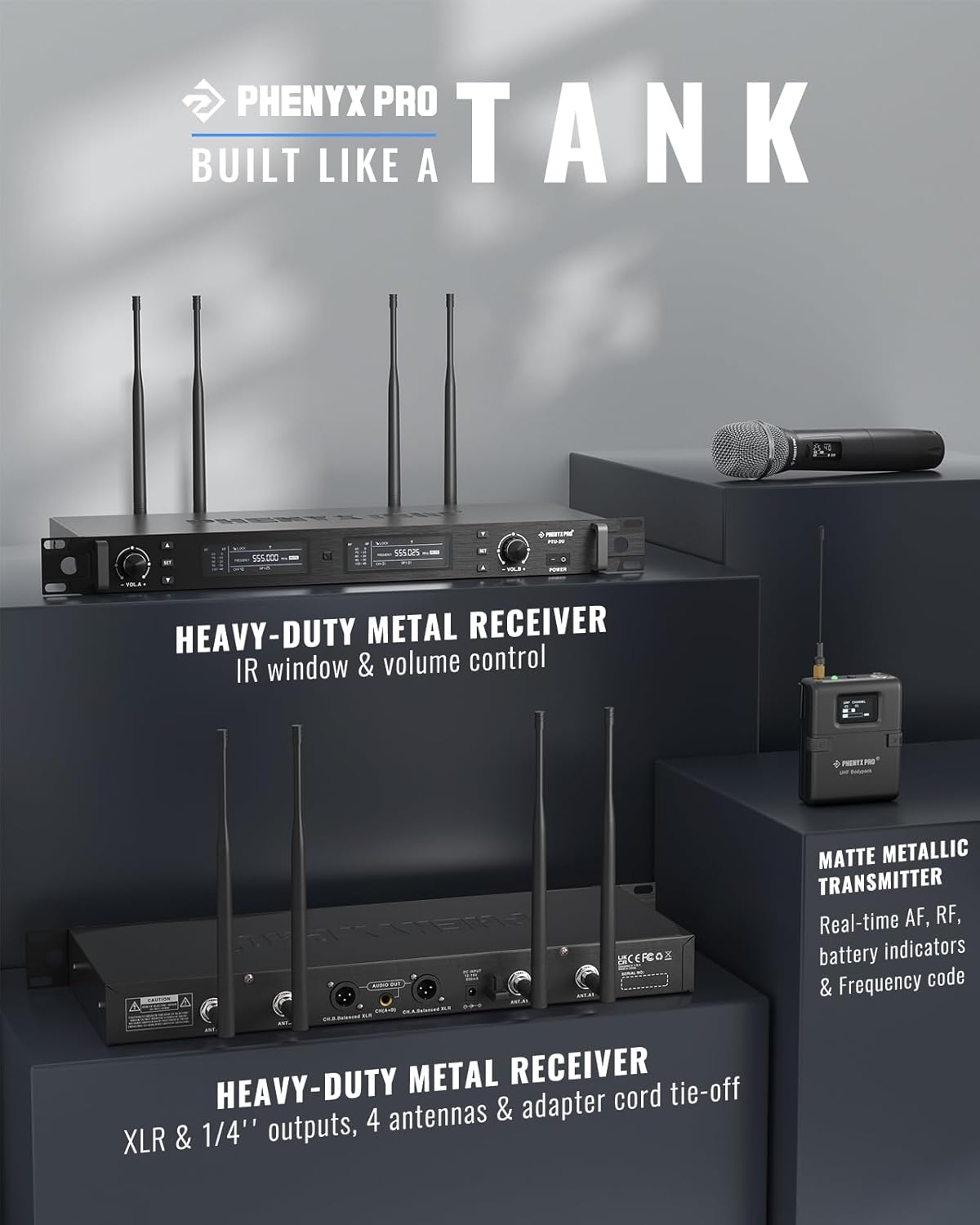 - STURDY BUILD, VERSATILE APPLICATION: Both wireless receiver, bodypack transmitter, and matte wireless mic features heavy-duty all-metal tank builds and sleek, elegant designs. Wireless handheld/lapel/headset mics in one set to satisfy various needs. The live performance microphone or professional microphone for singing can impress in any mid-to-large scale venue with its premium sound quality, suitable for stages, live shows, church worships, weddings, DJ gigs, and outdoor events.