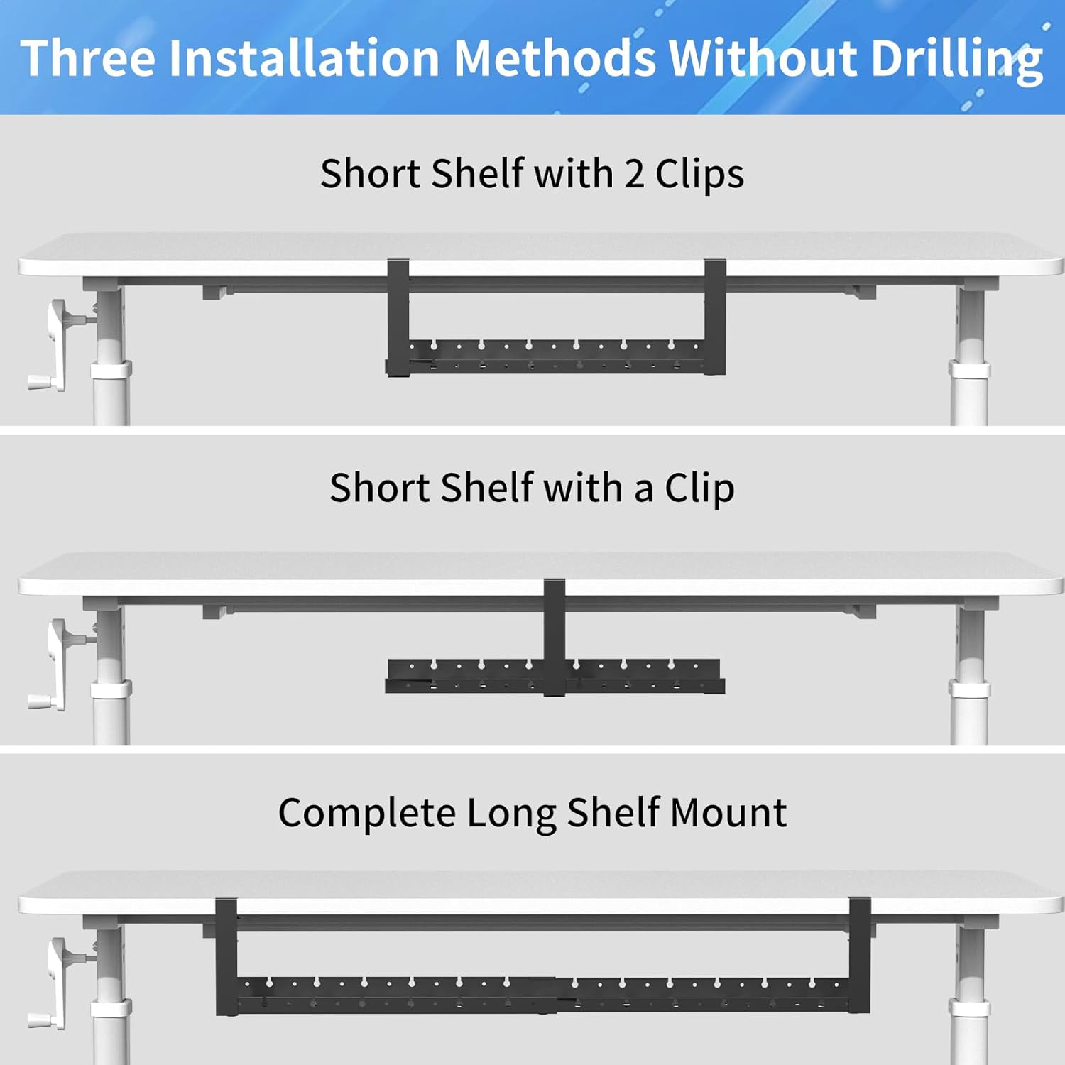 - NO DRILLING & EASY TO INSTALL: Instead Of Drill Your Desk And Damage The Desk With Screws, Our Under Desk Cable Management Tray Can Be Hanged Directly To Desk With Clamp, And Easily Change Its Length As Needed, Easy To Install Without Instructions, Make Your Management Plan Easy.