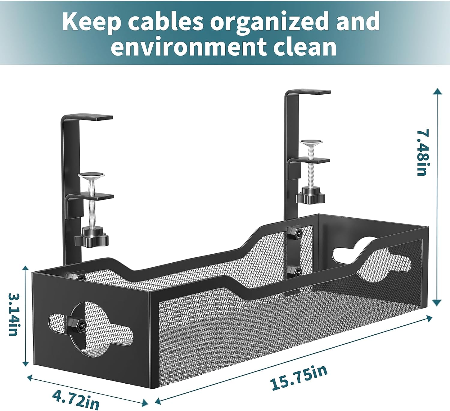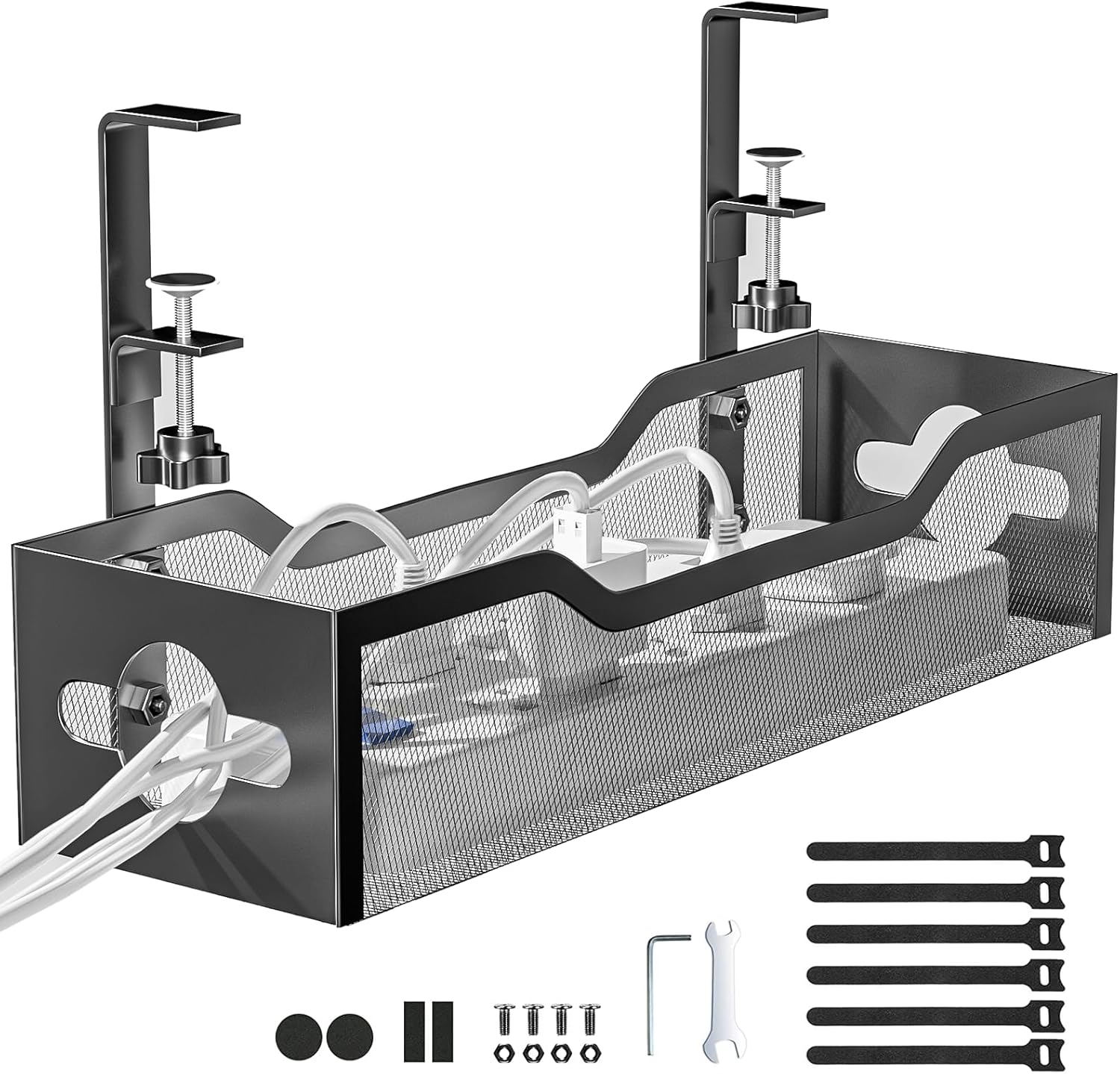 - 【Sturdy and Beautiful】Cord management under desk is made of high-quality carbon steel and holds about 15 lbs. The wire basket has 2 holes on each side of the tray to enable your cables to pass freely. Cable baskets are suitable for desk thickness use from 0.4" to 2".