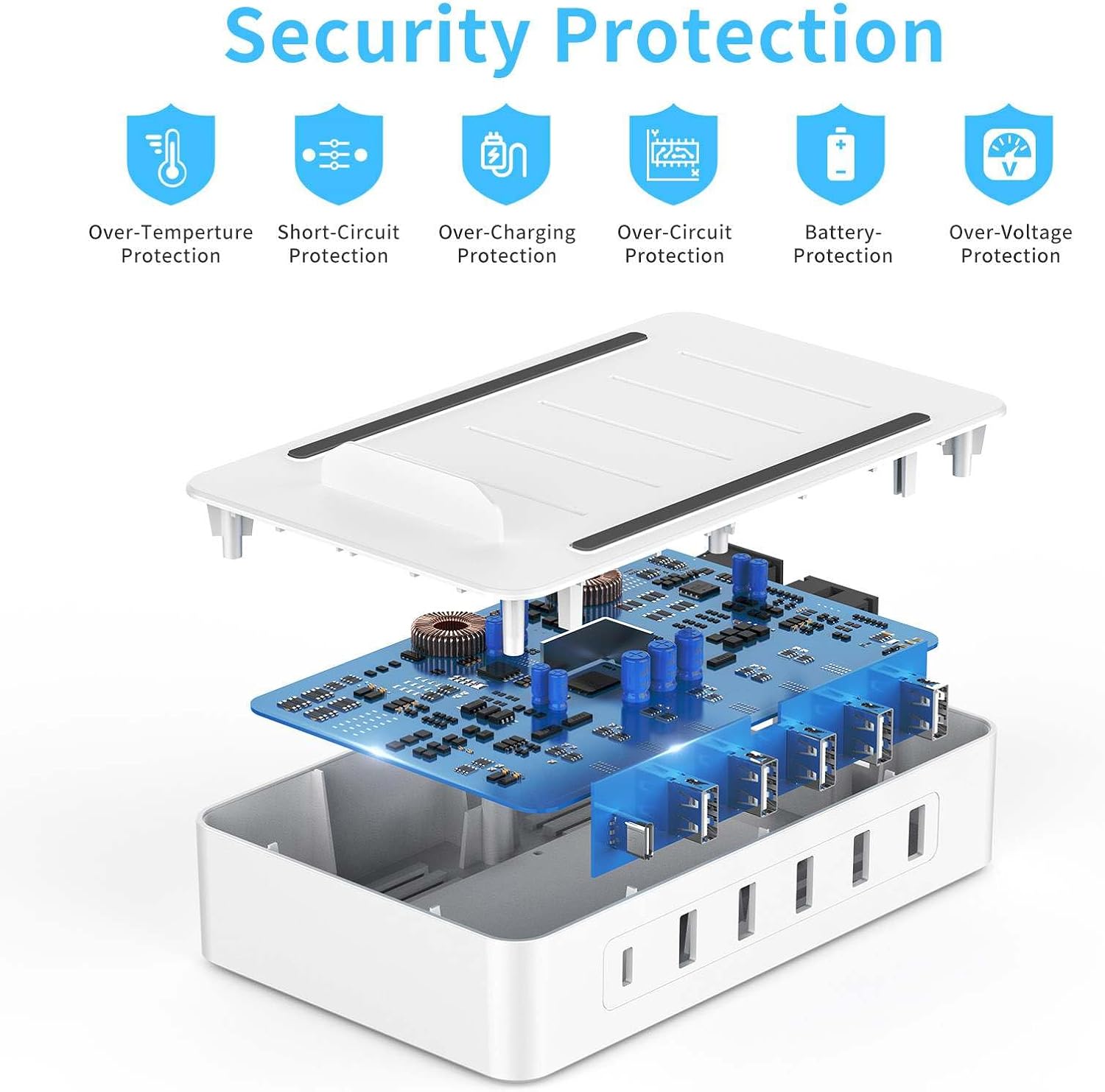 - √【Safety & Multi-Protection You Can Trust】Your devices are in good hands with our intelligent AI system, which identifies and distributes the required current for each device, ensuring stable and efficient charging. Moreover, the charging station comes with built-in over-current protection, over-charging protection, over-heat protection, short-circuit protection, battery protection, and over-voltage protection, giving you peace of mind while charging