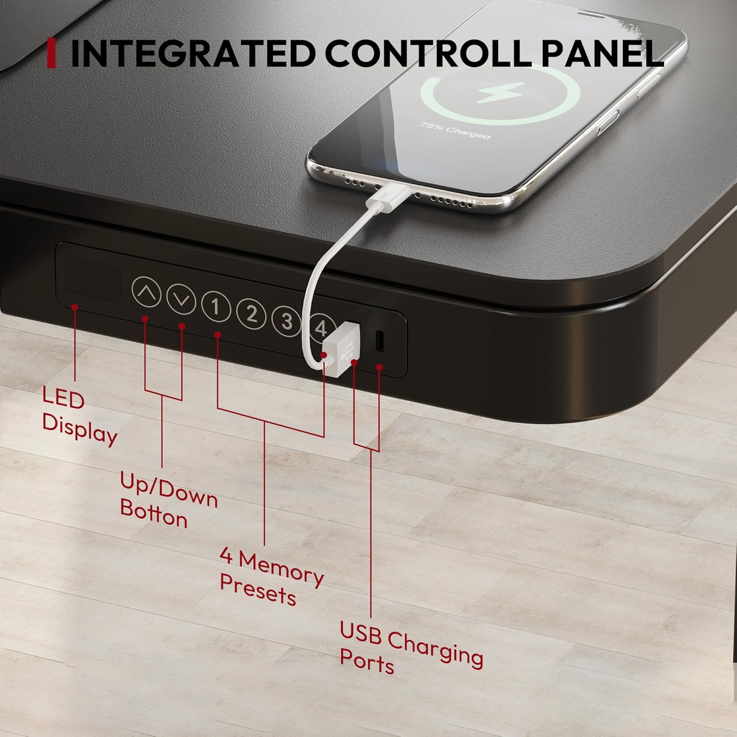 - Embedded Multiple Functions: Easily save multiple with four programmable height presets. Charge up to two devices with integrated USB ports (Type-C 45w, Type-A 18w) without mess & hassle. (Note: USB ports may pause charging while adjusting desk height).