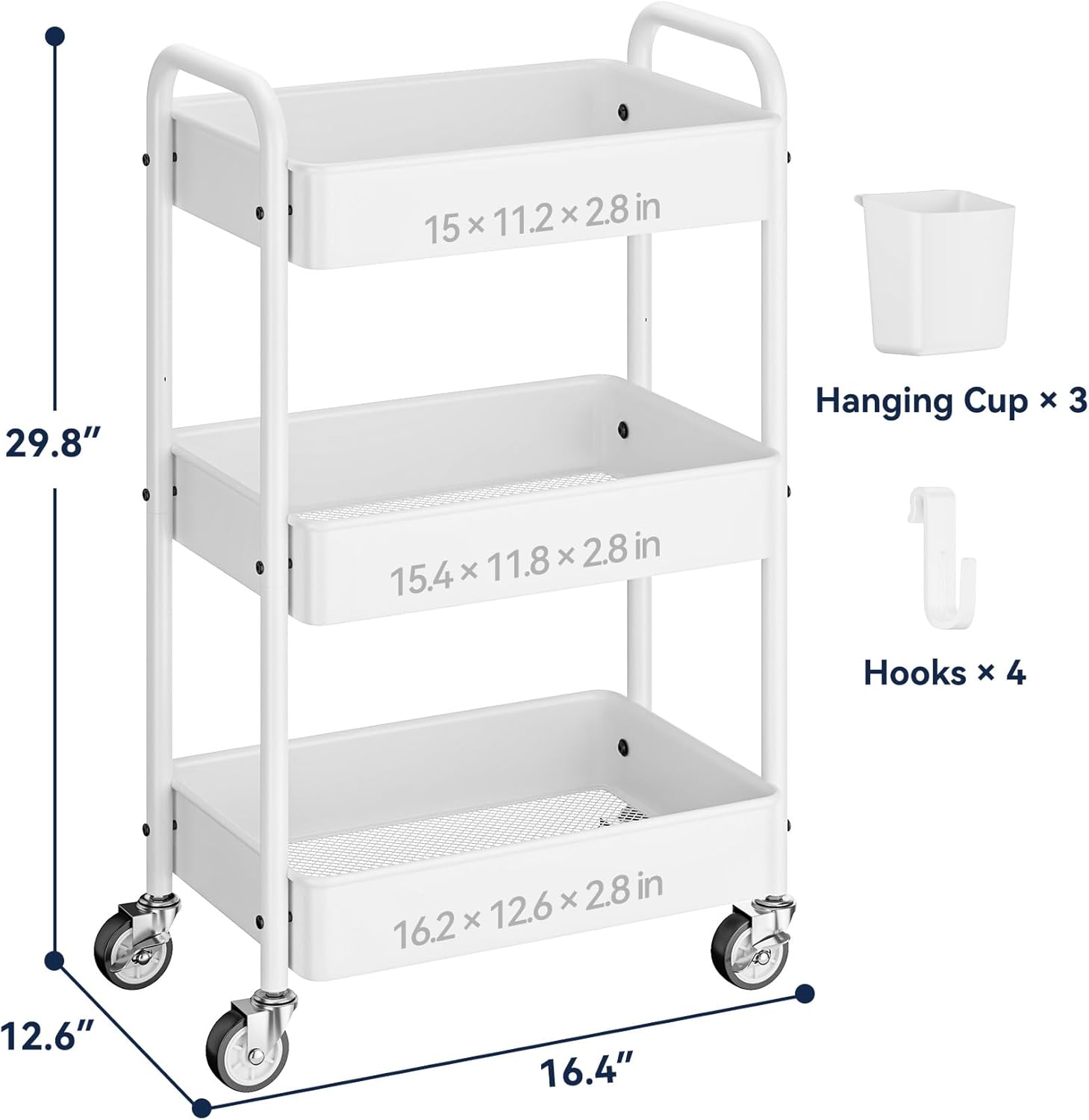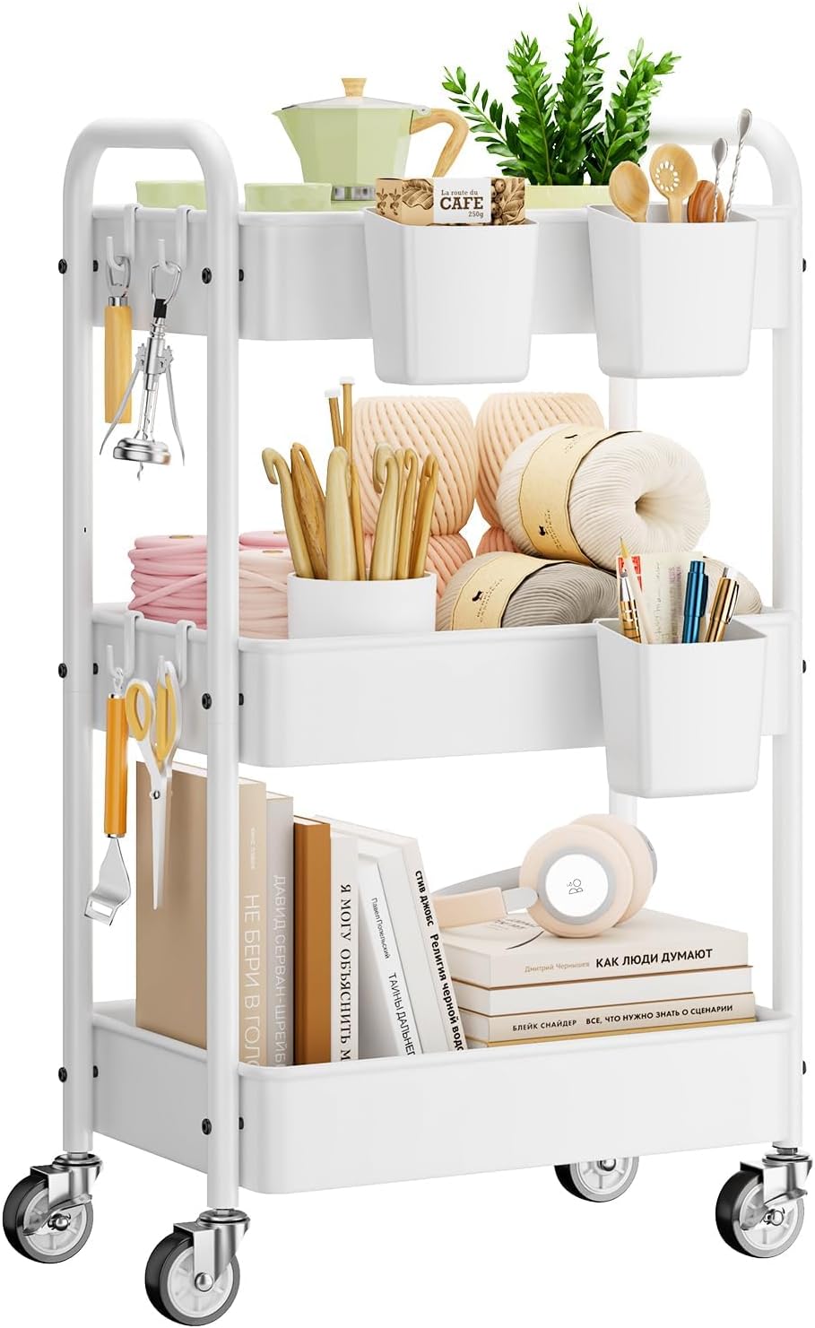 - Expanded Storage Capacity, Multiple Uses: The metal cart features 3 baskets, suitable for use as a craft cart, cleaning carts, book cart, art cart, makeup cart, diaper cart, service cart, snack cart, etc. and the added 3 hanging cups and 4 hooks provide extra space for small items