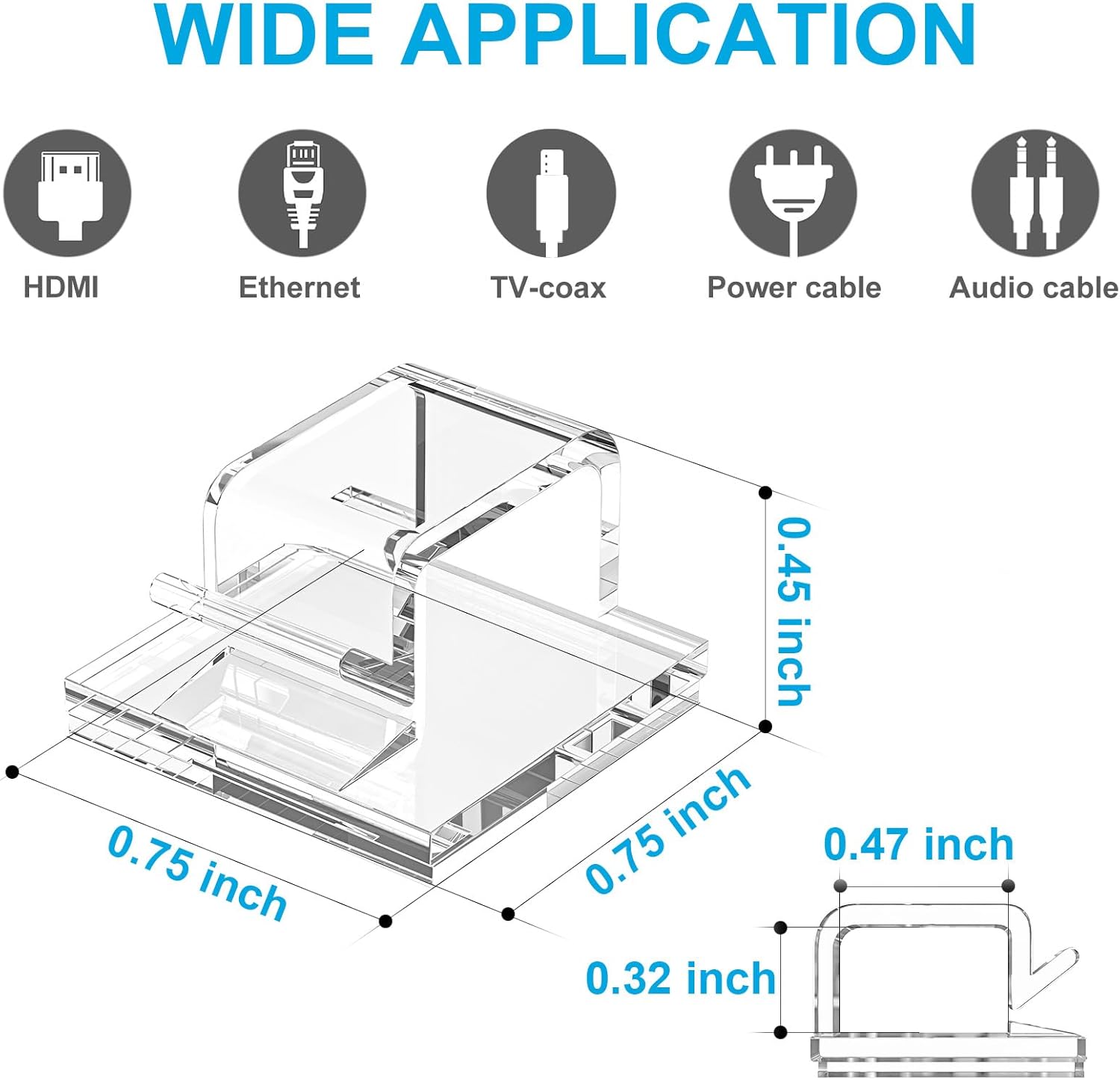 - Wide application: Size: 0.75 in*0.75 in*0.45 in, those cable management clips are suitable for wire diameter within 0.3 inch: outdoor christmas lights, led strip lights, HDMI, extension cord, ethernet cable, CAT-6, laptop power cable, TV-coax. Work perfectly on wall, glass, desk, metal surface.