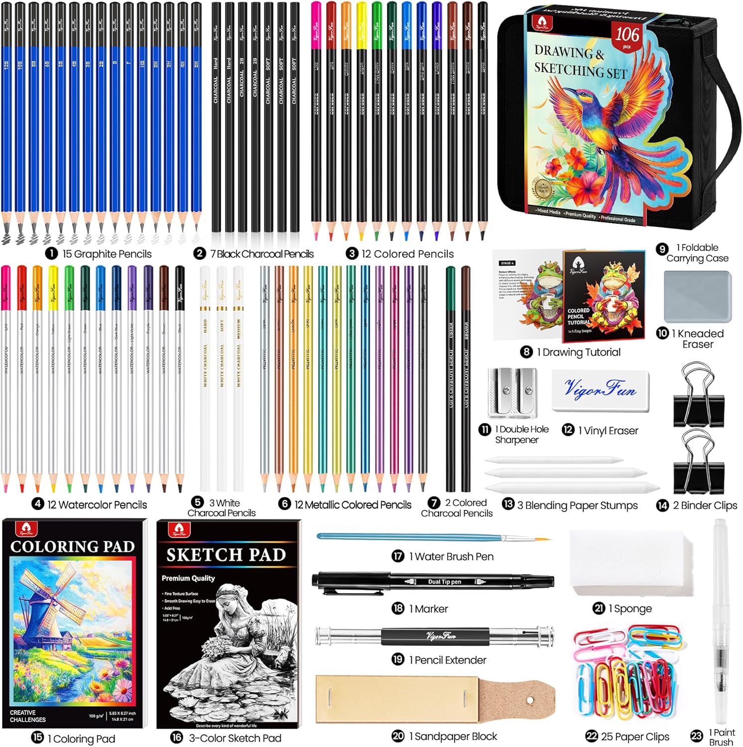 - 106 PCS Professional Drawing Kit Sketching Supplies: All you need are in this portable art case whether you are a professional or a beginner. It includes all the art supplies, specially added 3-color sketchbook and coloring book. Perfect for drawing, sketching, shading, blending, layering and adult coloring books. With our professional drawing supplies kits, let your imagination flow and bring your ideas to your artistic journey