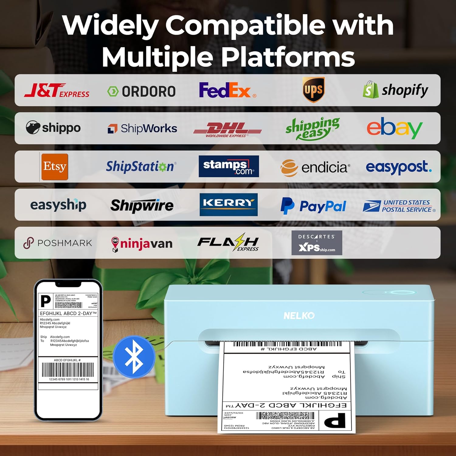 - Strong Platform Compatibility: This bluetooth shipping label printer can work with virtually all platforms, including Amazon, Ebay, Shopify, USPS, UPS, Esty, PayPal, Poshmark,etc.(Note: Please remember to save the logistics label as a PDF on the logistics platform, then upload it to the editor APP "NELKO" or "Shipping Printer Pro" for printing