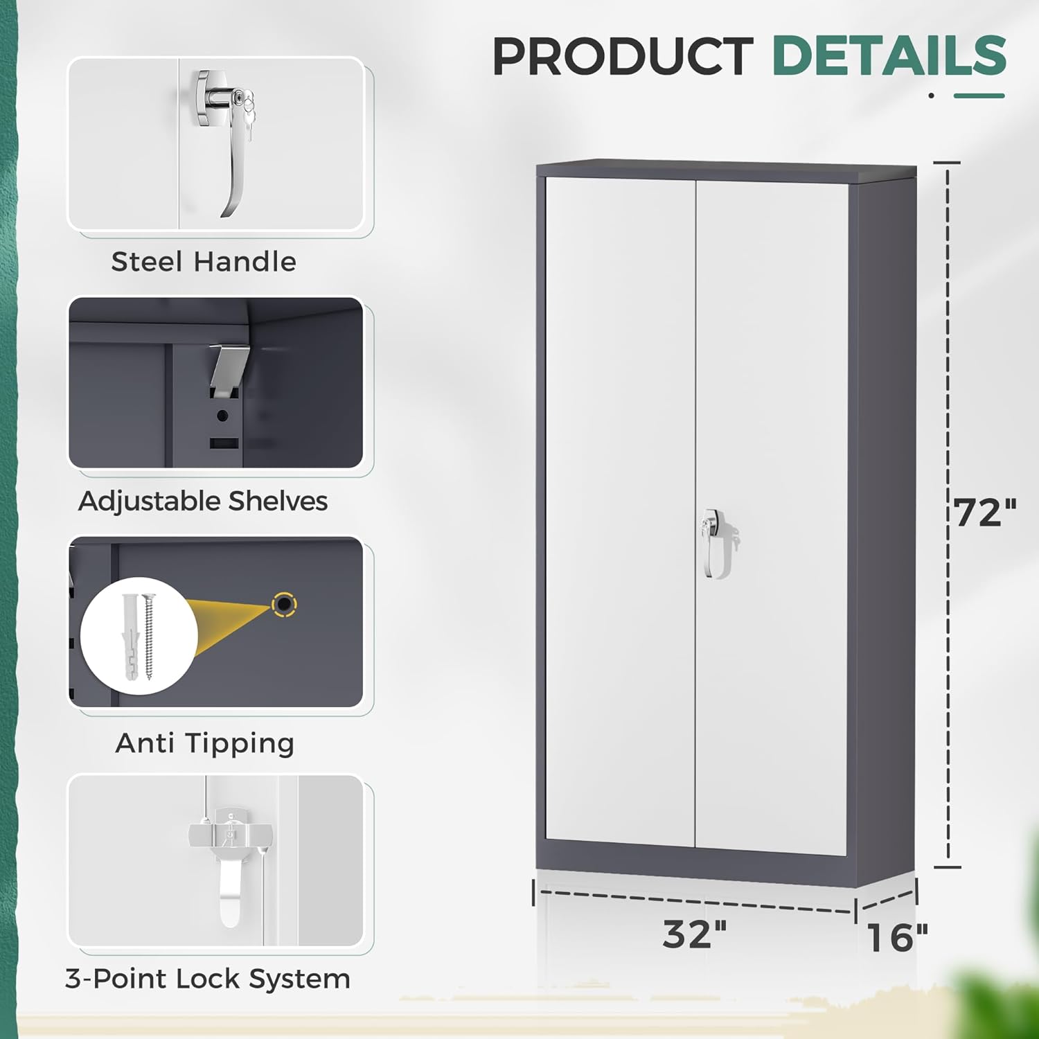 - 【Design to Prevent Tipping】Greenvelly 2 door metal cabinets have added a design to prevent tipping and can be more securely fixed to the wall. Prevent the cabinet from tipping forward due to heavy objects, protecting your and family's safety. Garage Mounted Storage Systems cabinets for storage with doors can also ensure the storage of more and heavier tools in areas such as classrooms, living room, tool rooms, and car repair shops.