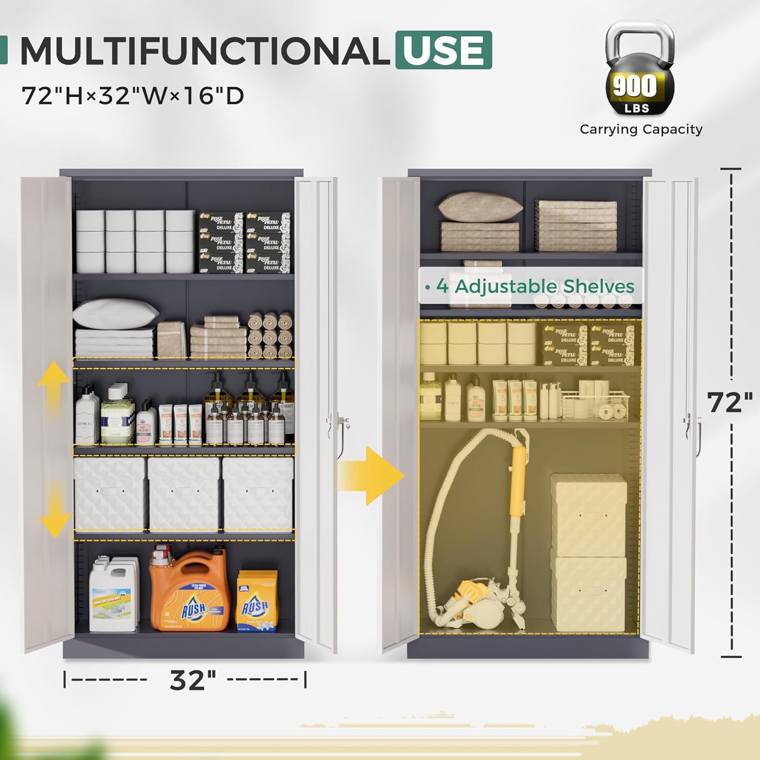 - 【Multipurpose Large Cabinet】Greenvelly lockable garage organization cabinet with 2 locking doors and 4 adjustable shelves, can move the shelves up or down according to your need, each layer can bear 150 pounds, suitable for storing office documents and tools, as well as heavy items. Durable black metal cabinets are an ideal choice for home office, utility room, laundry, kitchen, garage, school, shop, warehouse, business etc.