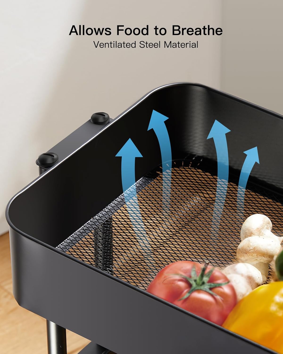 - Considerate Design:Two wheels are equipped with locks to keep the storage utility cart firmly in place, a great feature for families with children and pets. The 3 tier rolling cart is designed with steel mesh baskets for better airflow to keep items such as vegetables and fruit dry. Each utility craft cart basket of this utility cart is 3.54” deep so that your storage stays in place, even if it is round-shaped or prone to shifting during movement.
