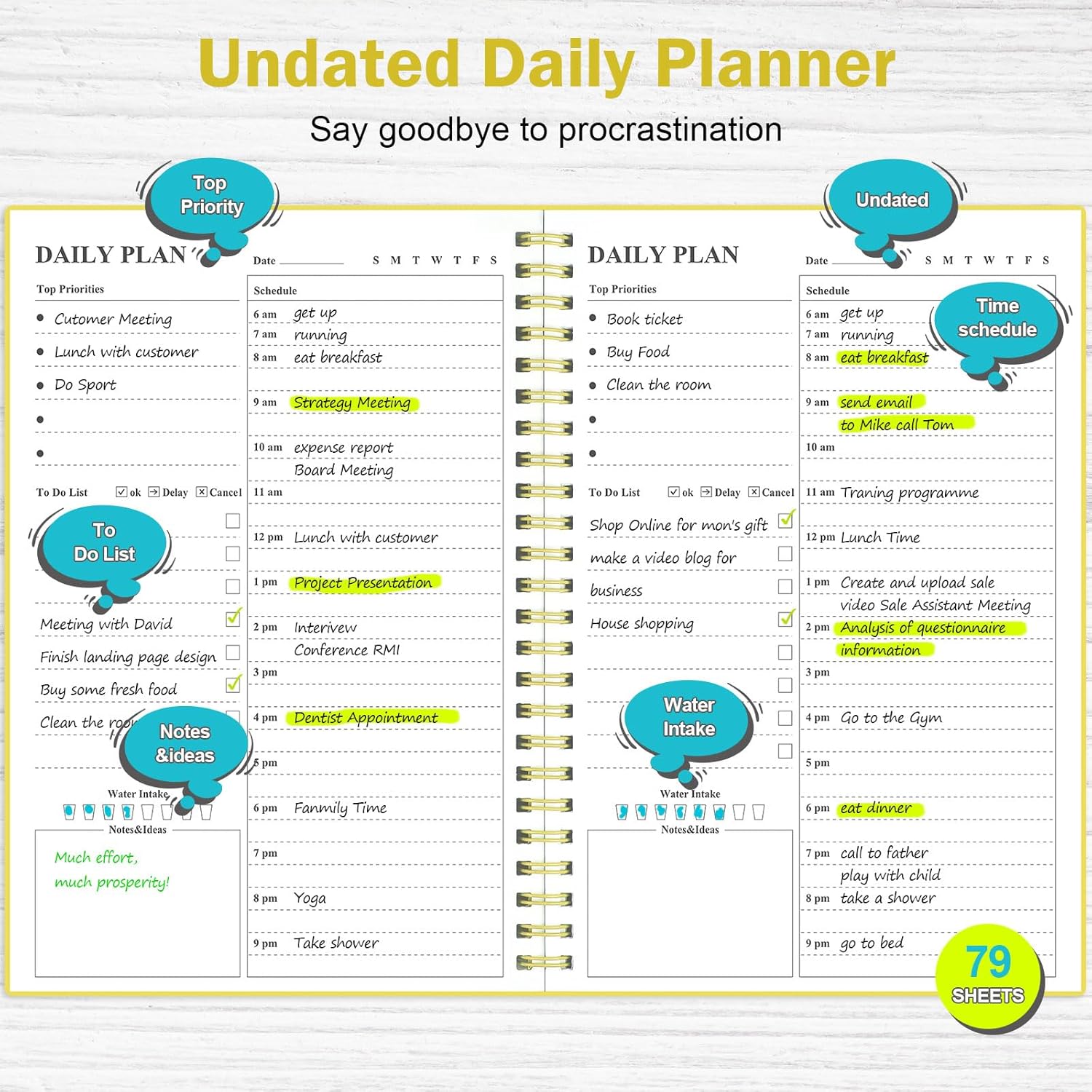 - Work Smarter with Daily Task Management: Each page offers dedicated space for your top 5 priorities, an 8-item to-do list, daily schedules from 6 am to 9 pm, room for notes and ideas, and a water intake tracker. Break your day into hours and supercharge your productivity.