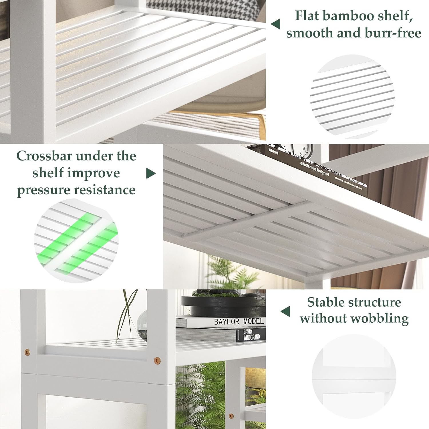 - Sturdy Structure: Cube structure ensures stability. A crossbar underneath each shelf for added durability. Please fix the bamboo bookshelf to the wall with the included anti-tip device for your and your family’s safety.