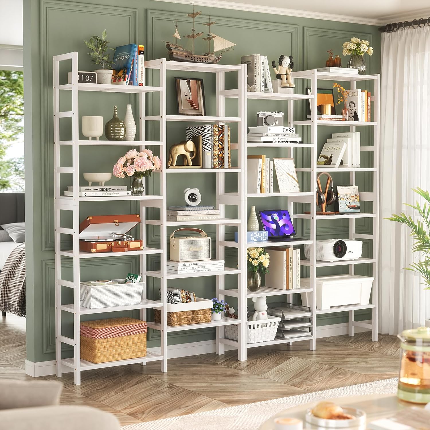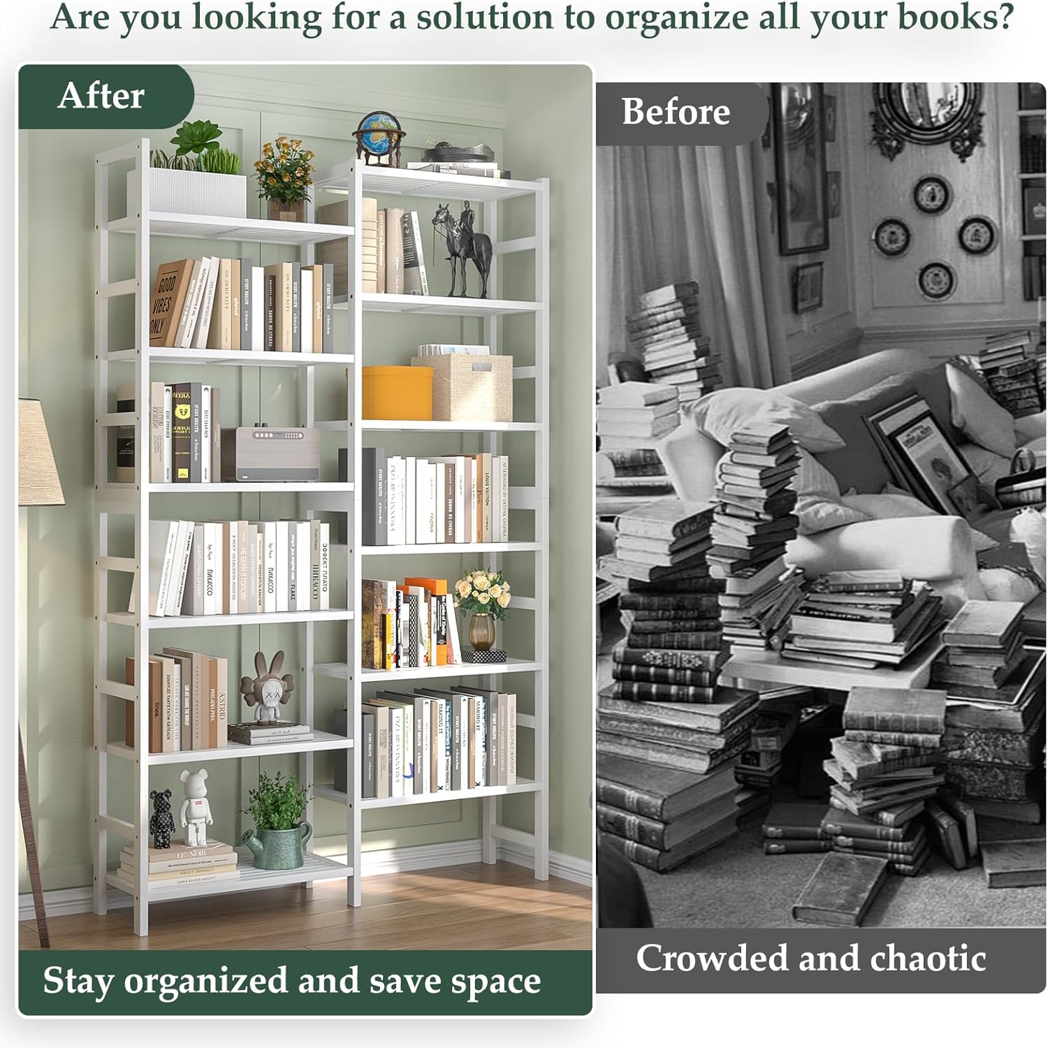 - Massive Storage Space: Dimensions are 41.14” W x 72.44” H x 10.63” D. The 6-tier double wide bookshelf features 12 individual open shelves, providing ample space for your books, collectibles, decorations, potted plants, photo frames, and more. Each layer can hold up to 44 lbs, for a total weight capacity of 528 lbs.