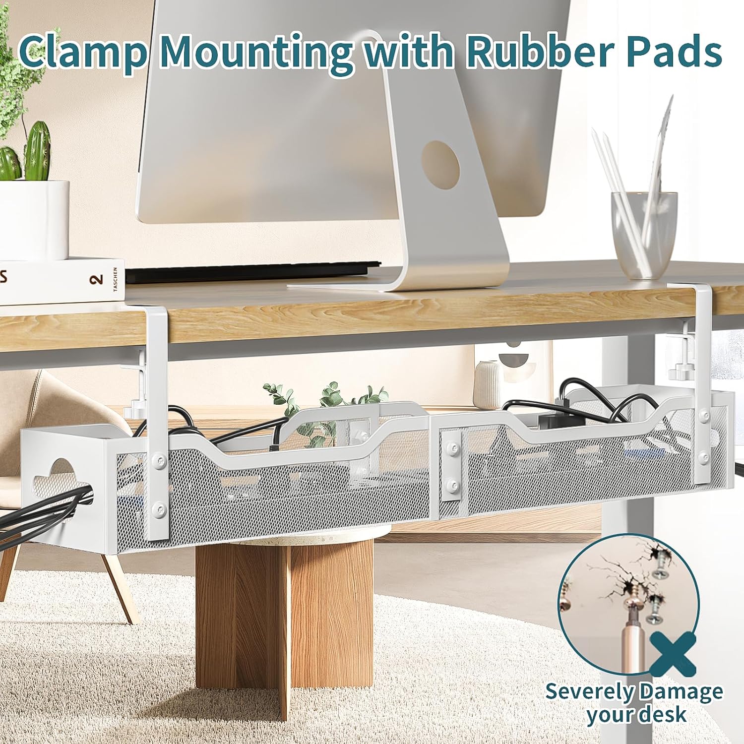 Under Desk Cable Management Tray White, Litwaro Cable Management Under Desk No Drill, 25'' Cable Tray with Clamp for Wire Management, Cord Organizer for Office, Home - No Damage to Table