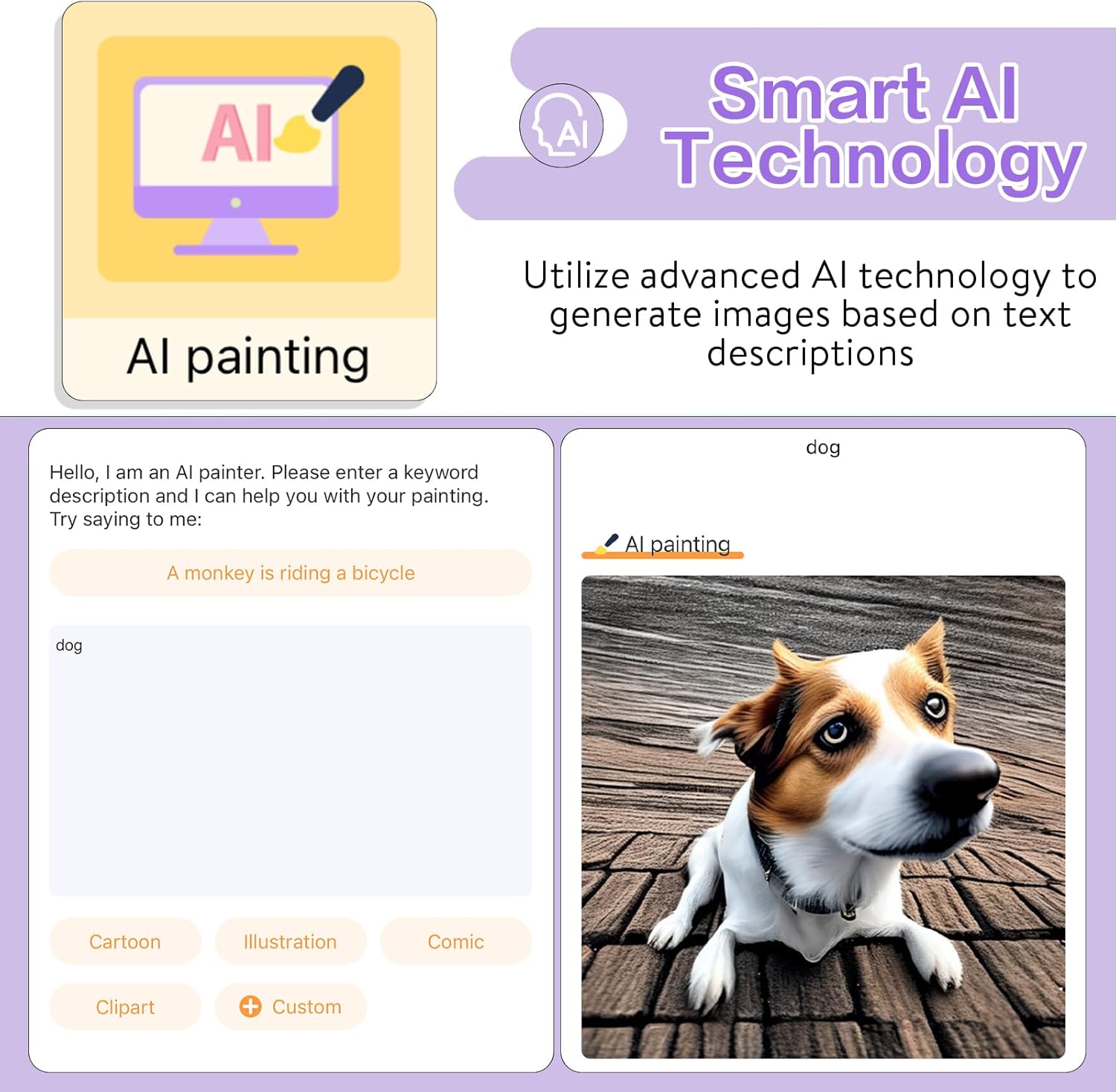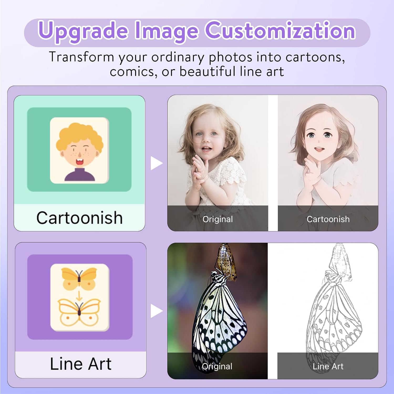 - AI Intelligent Printing: Newly upgraded AI function, AI intelligent generation of images, AI photo conversion into cartoons, line art, etc. Enter the text description of the desired image and generate the desired image for printing. You can also convert portrait photos into cartoons through AI intelligent conversion for more fun printing
