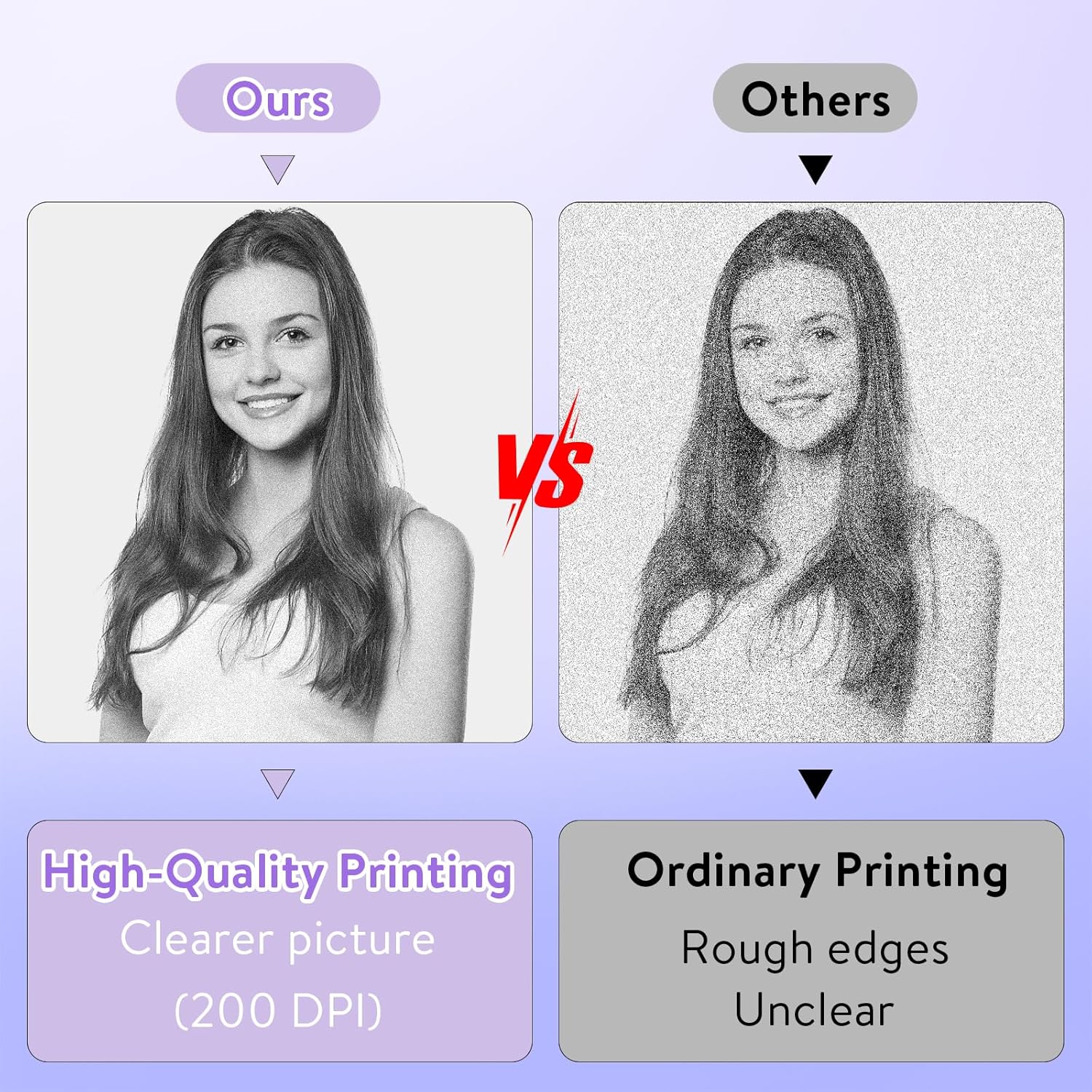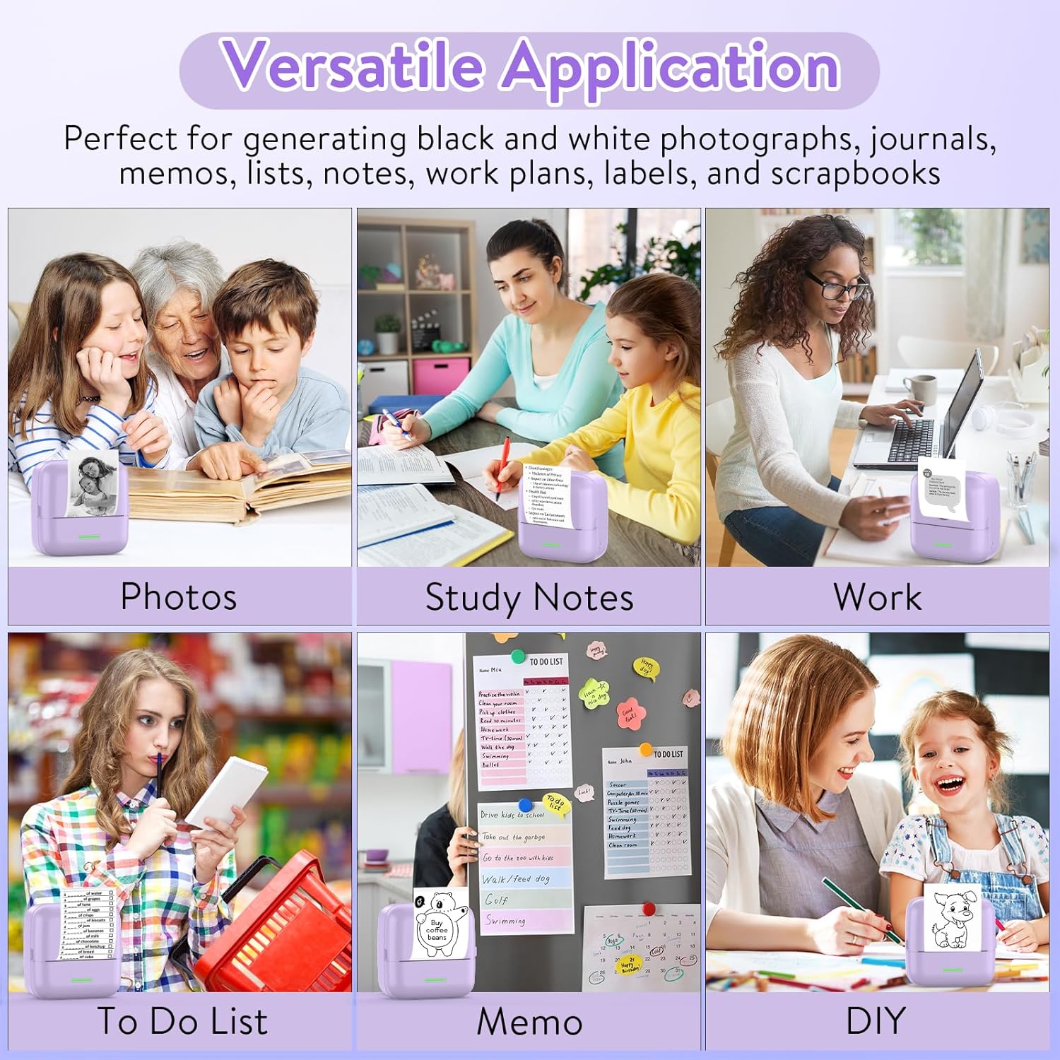 - Multipurpose & Perfect Present: This inkless printer for printing black and white photos, memos, labels, cute pet stickers, QR codes, etc. Information and images on the phone screen can be printed instantly. If you need a clearer print, please select the original image and darken the print. Improve efficiency by helping you organize and summarize work plans, shopping lists, and more. The ideal birthday, anniversary, Christmas present for anyone.