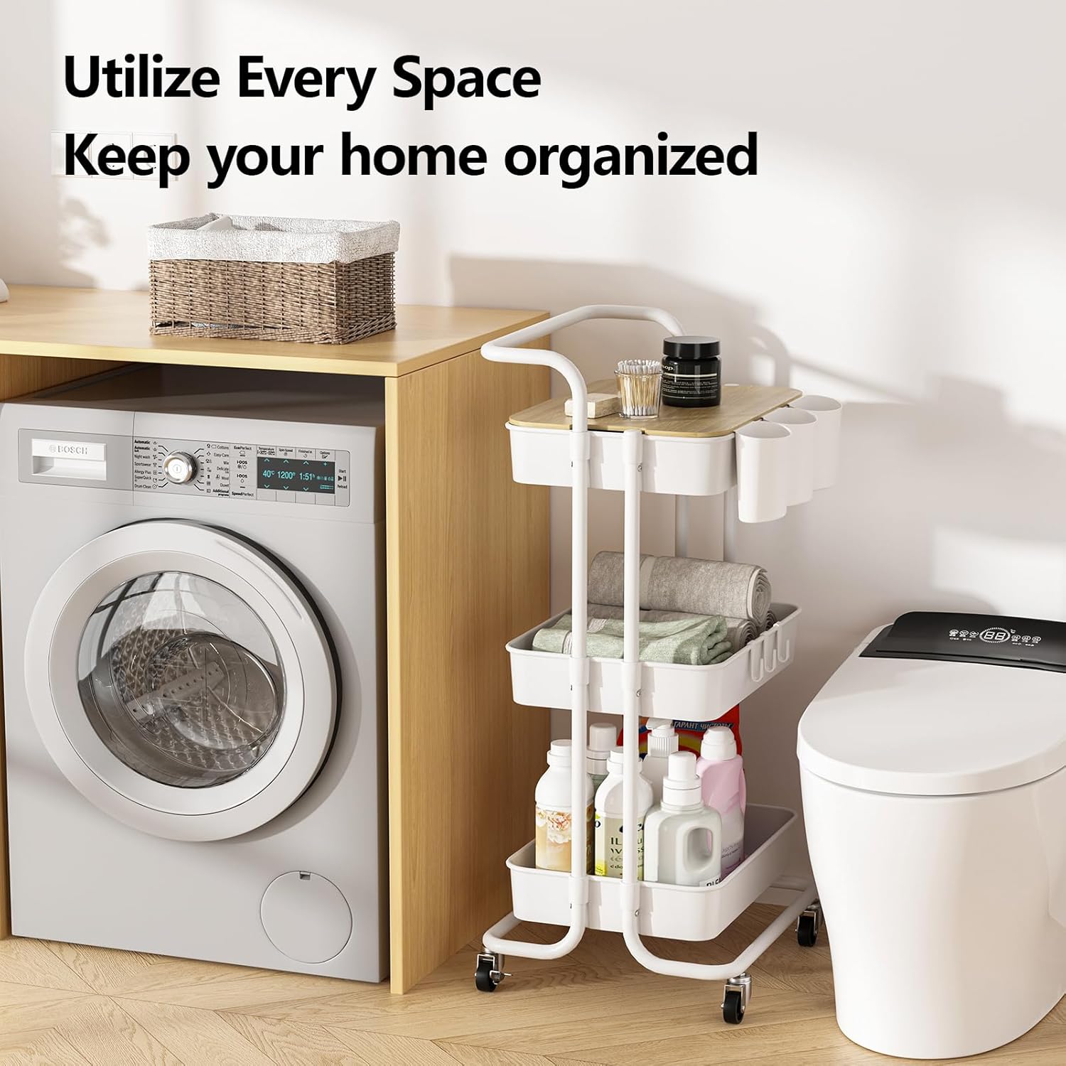 - 3 Tier Detachable Multifunctional Metal Rolling Cart with Metal handle,3 Hanging Cups,3 Hooks,1 Plank , 3 Plastic Storage Basket and 4 wheels including 2 Lockable Casters and 2 normal wheels. 3 tier rolling cart white, 3 drawer storage organizer white, 3 tier shelf white, 3 tier cart white, 3 tier storage organizer white, 3 tiered rolling cart white, 3 tier rolling cart metal white, 3 tier drawer organizer white, 3 tier metal rolling cart white, 3 tier cart with wheels white,