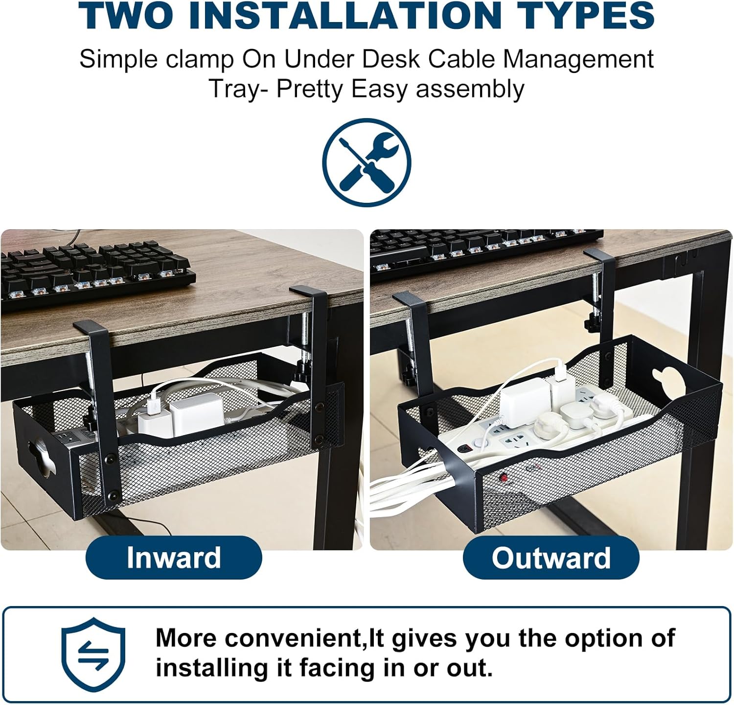 - Tool-Free Installation-Universal compatibility meets effortless setup! Adjustable mounting brackets (0.4''-2'' thickness) fit all standing desks, L-shaped workstations, and office furniture. No drilling required—simply slide, tighten the knobs, and enjoy clutter-free cable organization in 60 seconds.