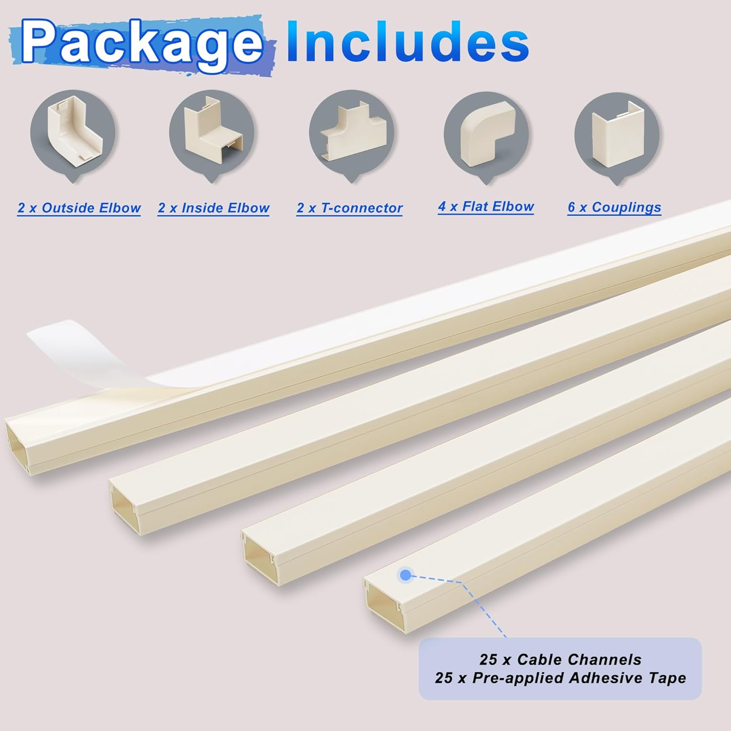 - Simple to install: Peel off the self-adhesive backing and conceal cords in the wall 25 individual wire channels, enough length to meet your needs. It has a smooth cutting surface, and can be easily installed without accessories for a seamless connection. You can also use the accessories as connections and extend your installation range to hide corners or cable nooks.