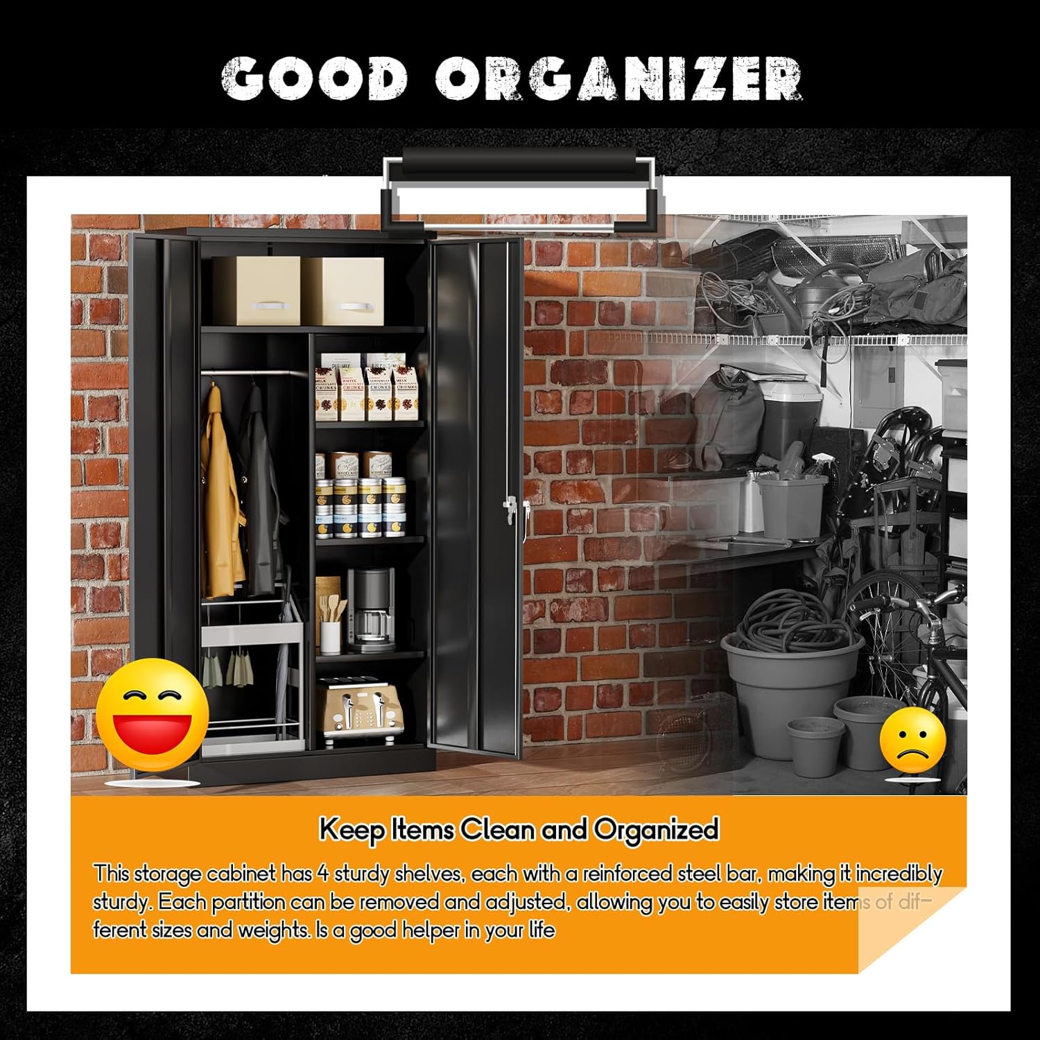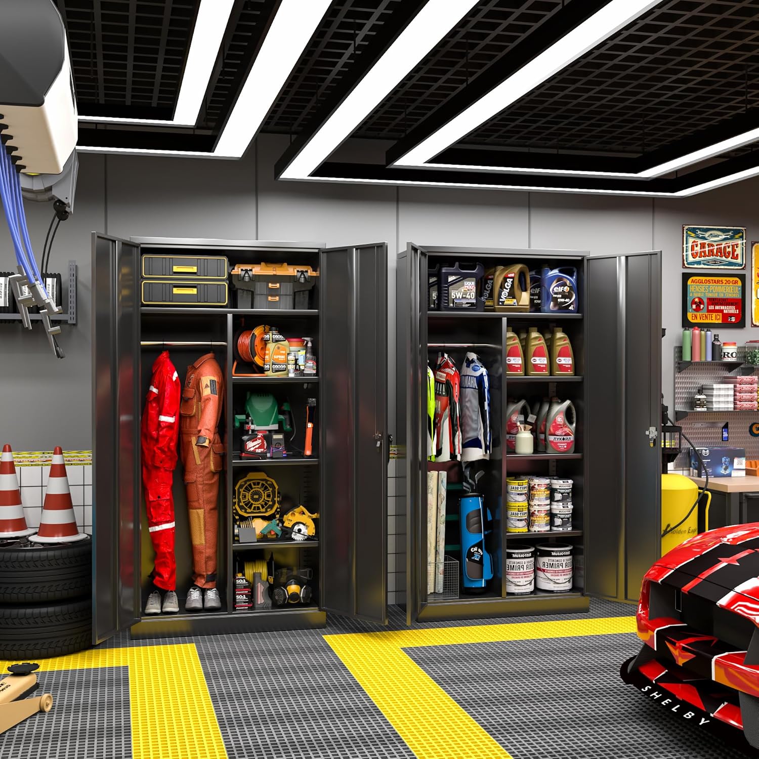 - ★【Extra Large Capacity】: Greenvelly lockable metal garage storage cabinet adopts a large size design of 72 "H x 36" W x18 "D, which can provide sufficient storage space. The tall steel storage cabinet has hanging railings and 3 shelves, which not only have hanging clothes but also storage partitions, making it versatile. Metal lockers with locked doors are great for protecting your property and are suitable for garages, home offices, cleaning rooms, utility rooms, and laundry rooms.