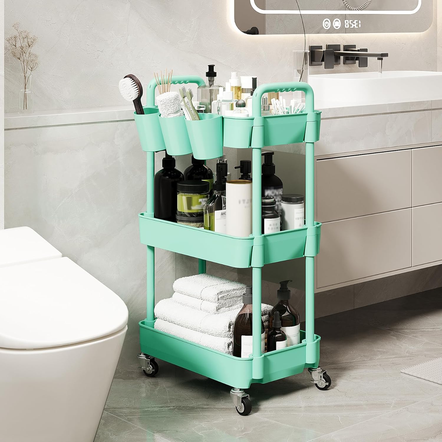 UDEAR 3-Tier Rolling Utility Cart,Multifunctional Storage Shelves with Handle and Lockable Wheels for Room,Office,Kitchen,Bathroom,with 3 Hanging Cups,Green