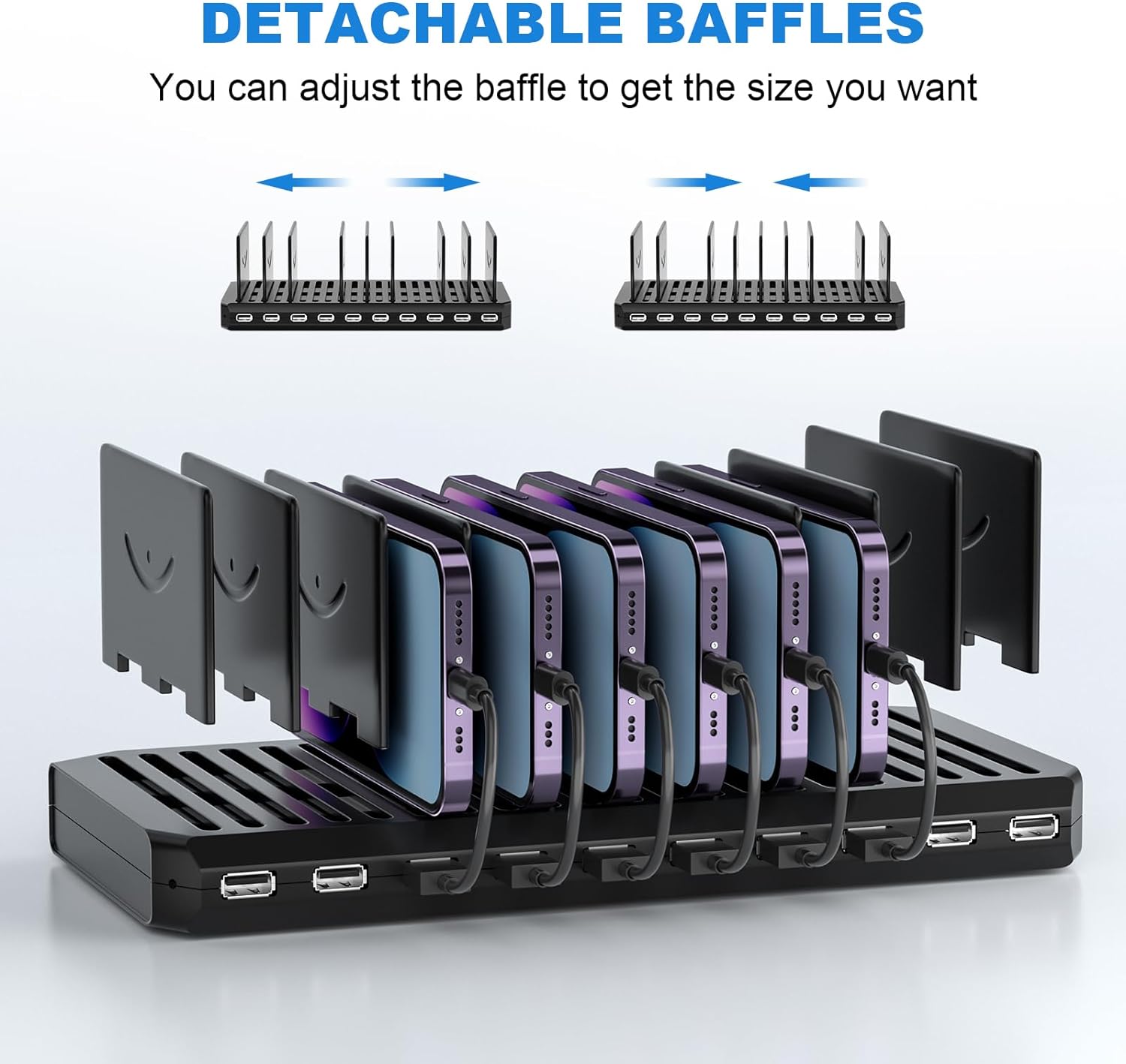 - 【Neat and Organized】60W 10-Port USB Charger Station Organizer can charge up to 10 devices simultaneously in one place. The adjustable dividers easily adjust the width to fit your needs, even large tablets with thick cases. Take the hassle out of cluttered cables, keep your desktop neat and organized, and make room for outlets. Note: NO CORDS!