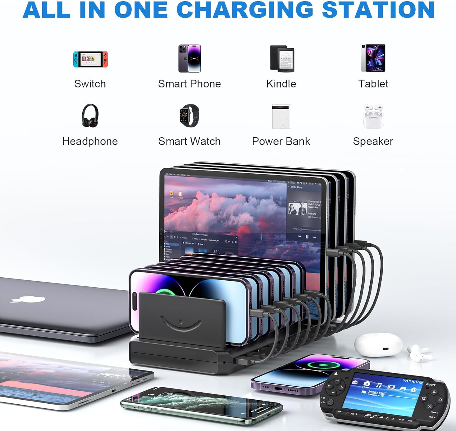 - 【Wide Compatibility】The Charging Station for Multiple devices supports all types of USB charging cables, The Cinlinso charger station is compatible with Apple and Android phones, tablets, headphones, kindle, and other electronics. It can be used in homes, offices, schools, restaurants and hotels. The lightweight design makes it easy to carry wherever you go. It is also a perfect practical gift for family and friends.