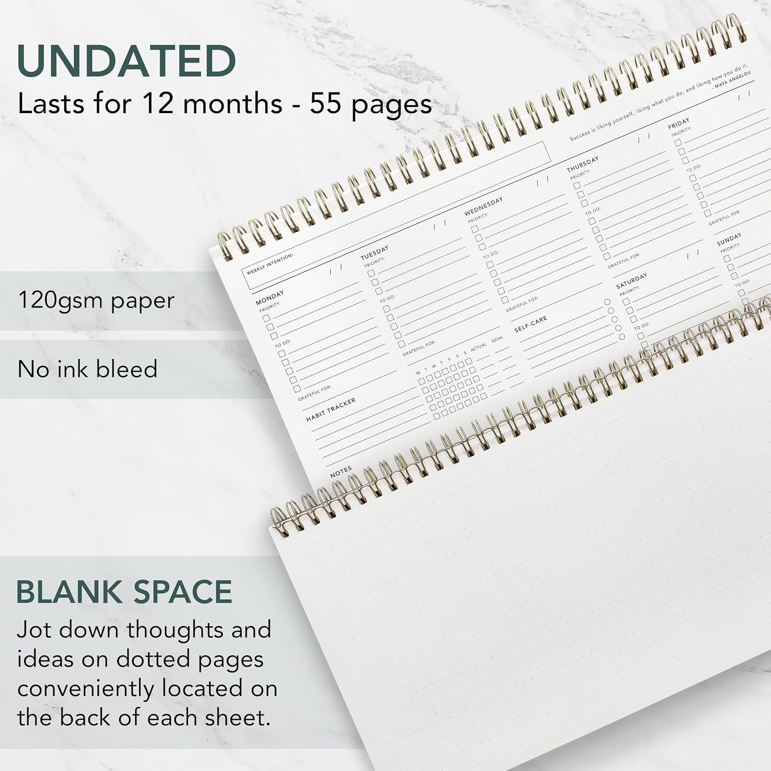- ✍️ UNDATED WEEKLY PLANNER: Begin your journey of enhanced wellbeing and productivity at any point in the year with our undated weekly planner, your ultimate dashboard desk pad. No more wasted pages – take control of your schedule on your terms.