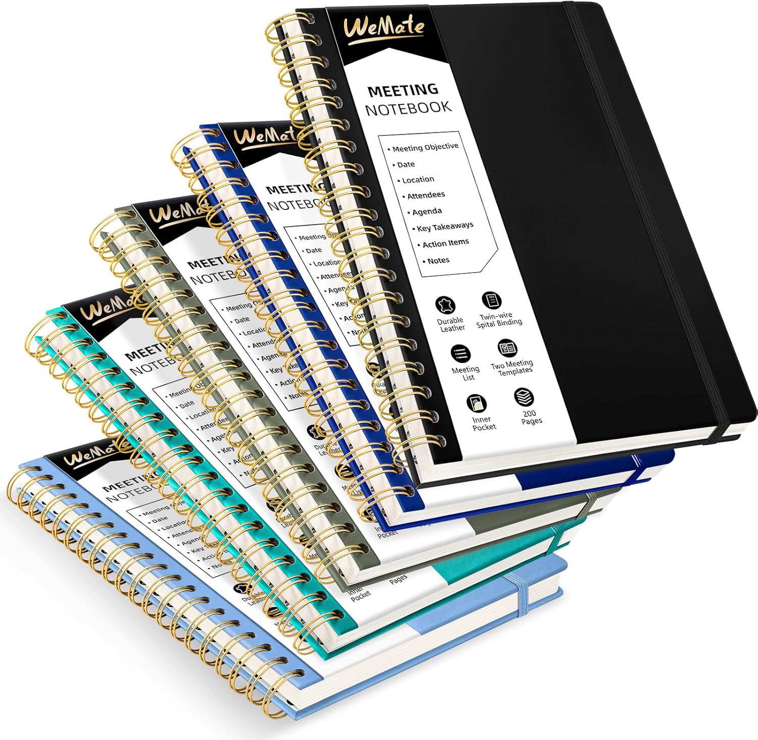 WEMATE 5 Pack Meeting Notebooks for Work(7"x10") 200 Pages, PU Leather Notebook with Action Items & Note, For Staff & Students, Meeting, Projects Planning- Black, Blue, Green, Olive Green, Dark Blue