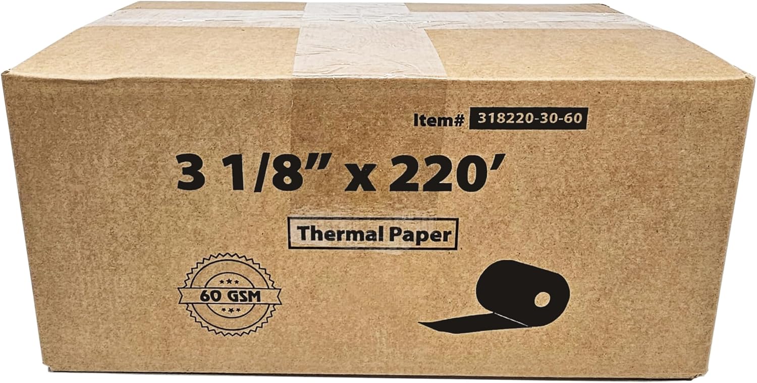 - 3 1/8” x 220’: BPA Free Thermal Roll Paper - 60 GSM Heavy Thermal Paper