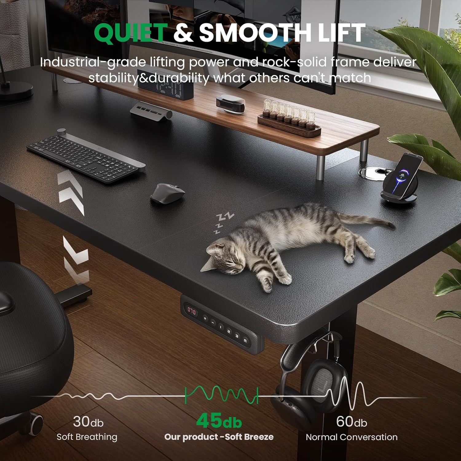 - Customized Sit Stand Desk : The reliable motor operates quietly (under 45 dB)and smoothly, all your things stay steady&secure in motion. The intuitive control panel allows you to preset 3 preferred heights, switch between sitting and standing positions has never been easier. Child lock for total peace of mind.
