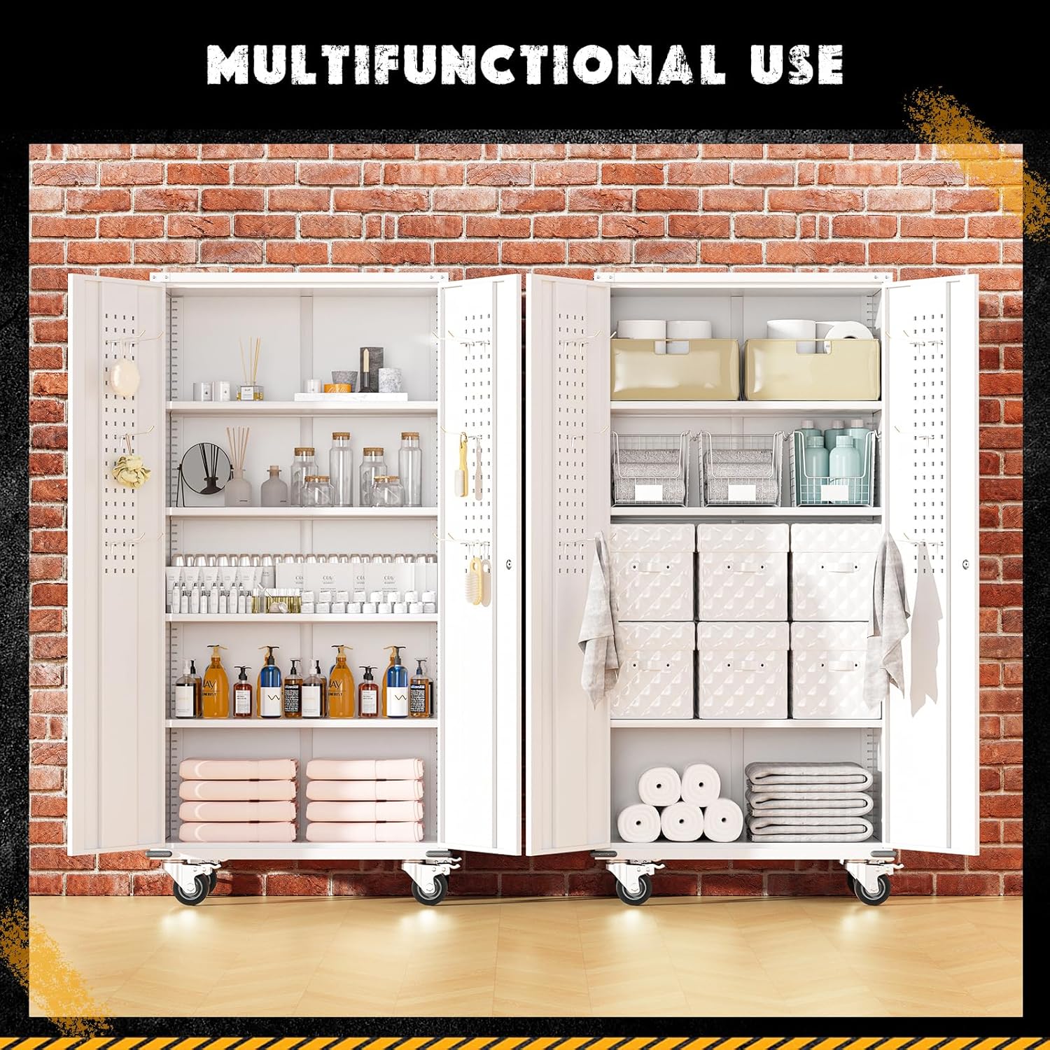 - 【Multiple Uses】:Greenvelly lockable metal storage cabinet perfect way to organize and conceal your belongings, the 4 adjustable dividers allow you to combine any storage space you need, and the detachable rollers allow you to move the cabinets to any room in your home. Whether it's storing tools, laundry supplies, sundries or office documents, lockable metal storage cabinet can meet your needs.